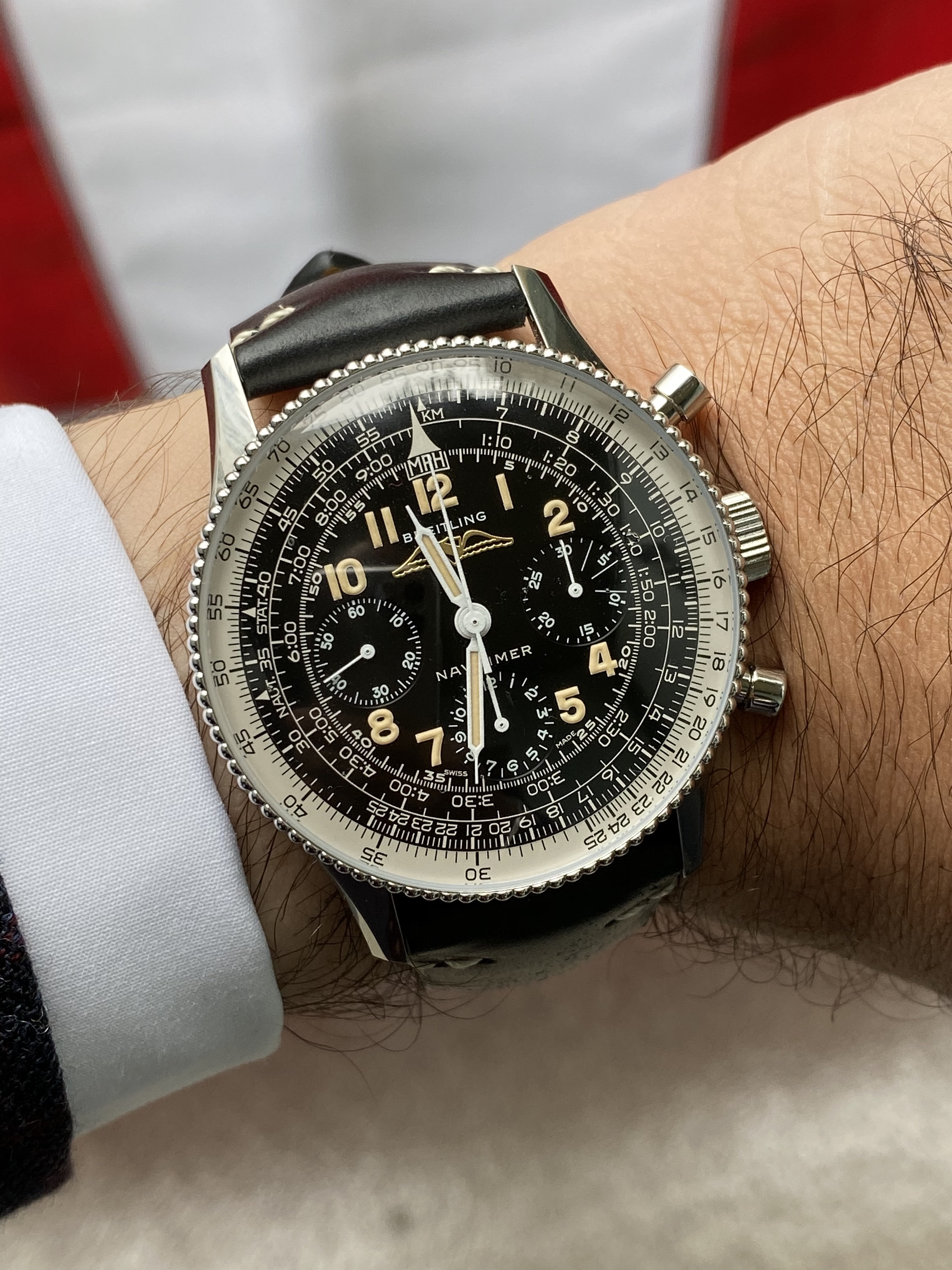 The dial is fantastic. A lot of retro, 50's and 60's vibes in a wearable size (not a big fan of the huge navitimers but obviously the size depends on your wrist. I also like the IWC big pilot that is 46mm so..it depends!)