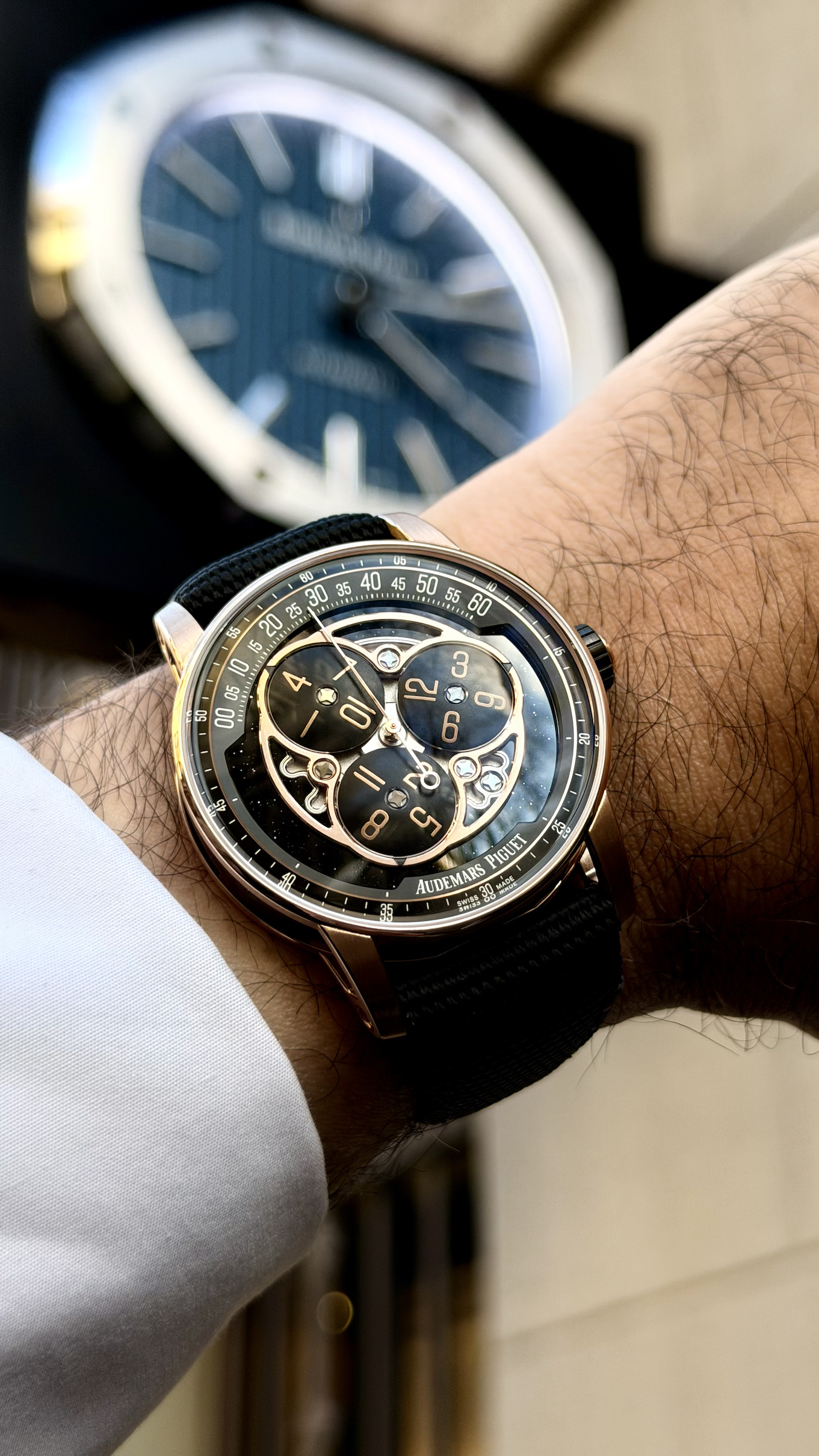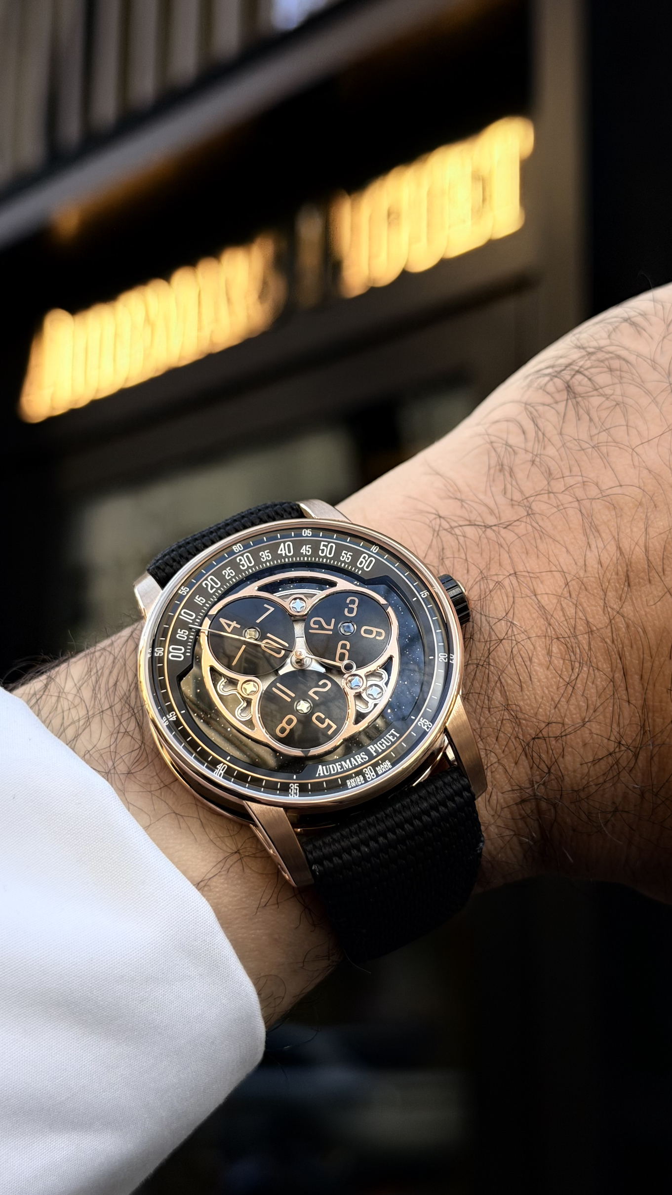 I had been eyeing the Code 11.59 collection for a while—since the Royal Oak Offshore review, in fact—but it was the Starwheel that truly captivated me. This is one of the most highly sought-after models in the current AP catalogue, so when a special occasion came along, I asked the boutique if they could make the impossible possible—and they did. Once you see those three rotating hour discs in the metal, you simply cannot look away. The concept is mesmerising: instead of traditional hour and minute hands, the hours are displayed on three satellite discs that rotate around the dial, each disc showing four hours. A single central minute hand sweeps across a peripheral minute track. It is a complication that traces its roots back to 17th-century pocket watches, yet here it feels utterly contemporary.