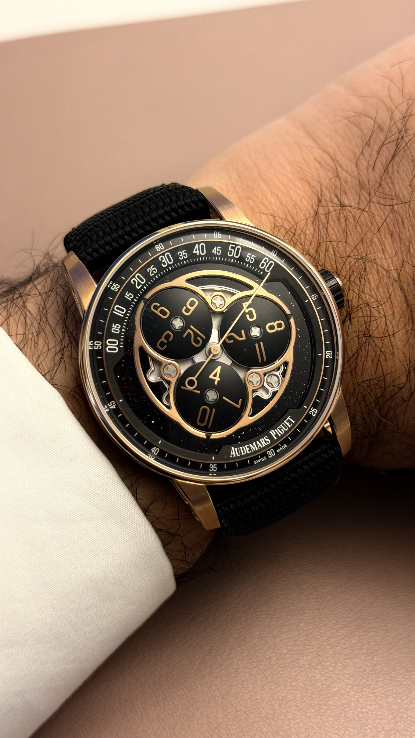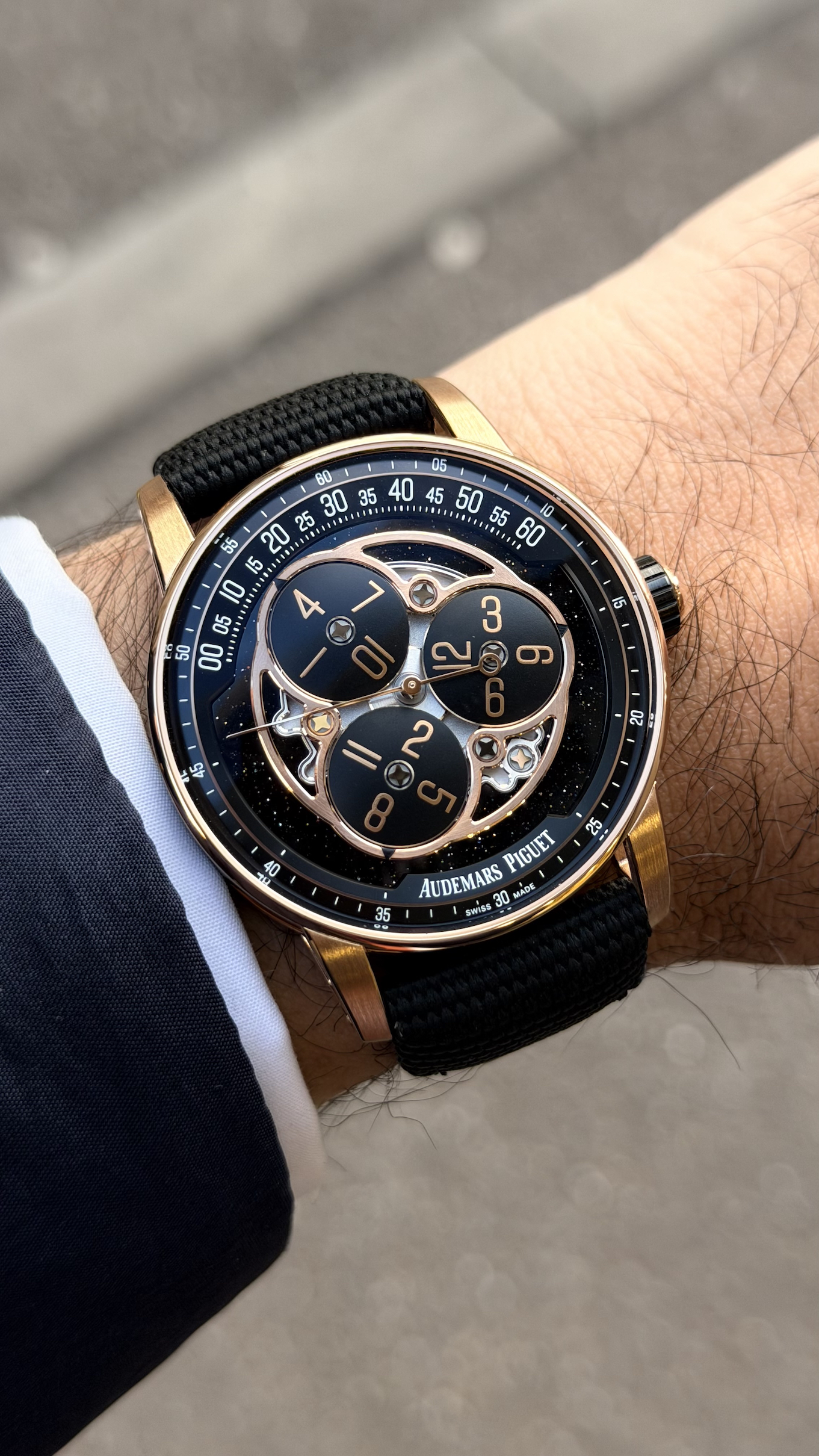 I wore the Code 11.59 Starwheel with a dark navy suit and it felt absolutely at home. The black textile strap—with its woven fabric texture—pairs perfectly with the ceramic and pink gold case, lending the watch an understated elegance that works equally well in a business setting or a more casual environment. The folding clasp is secure and easy to operate.