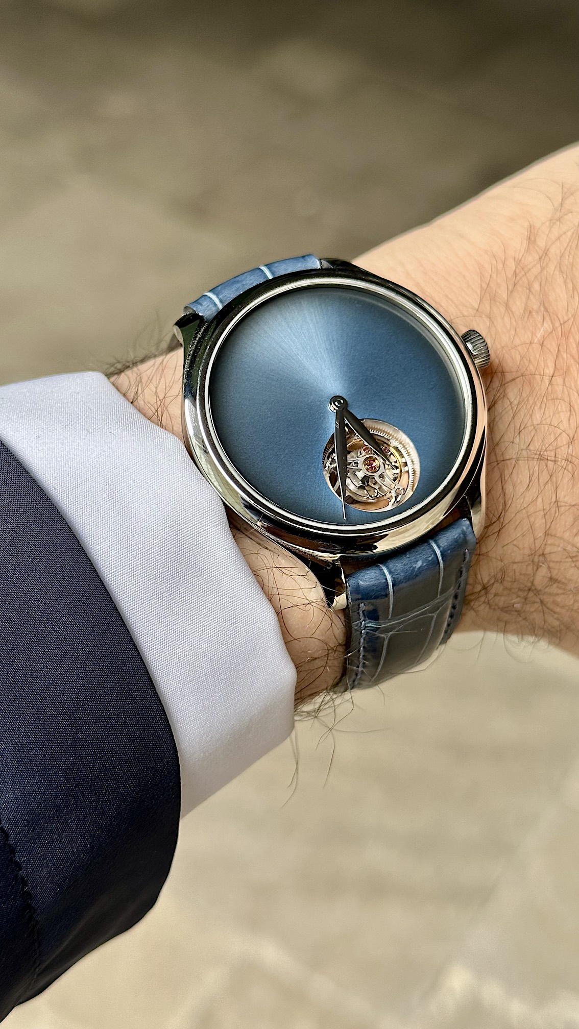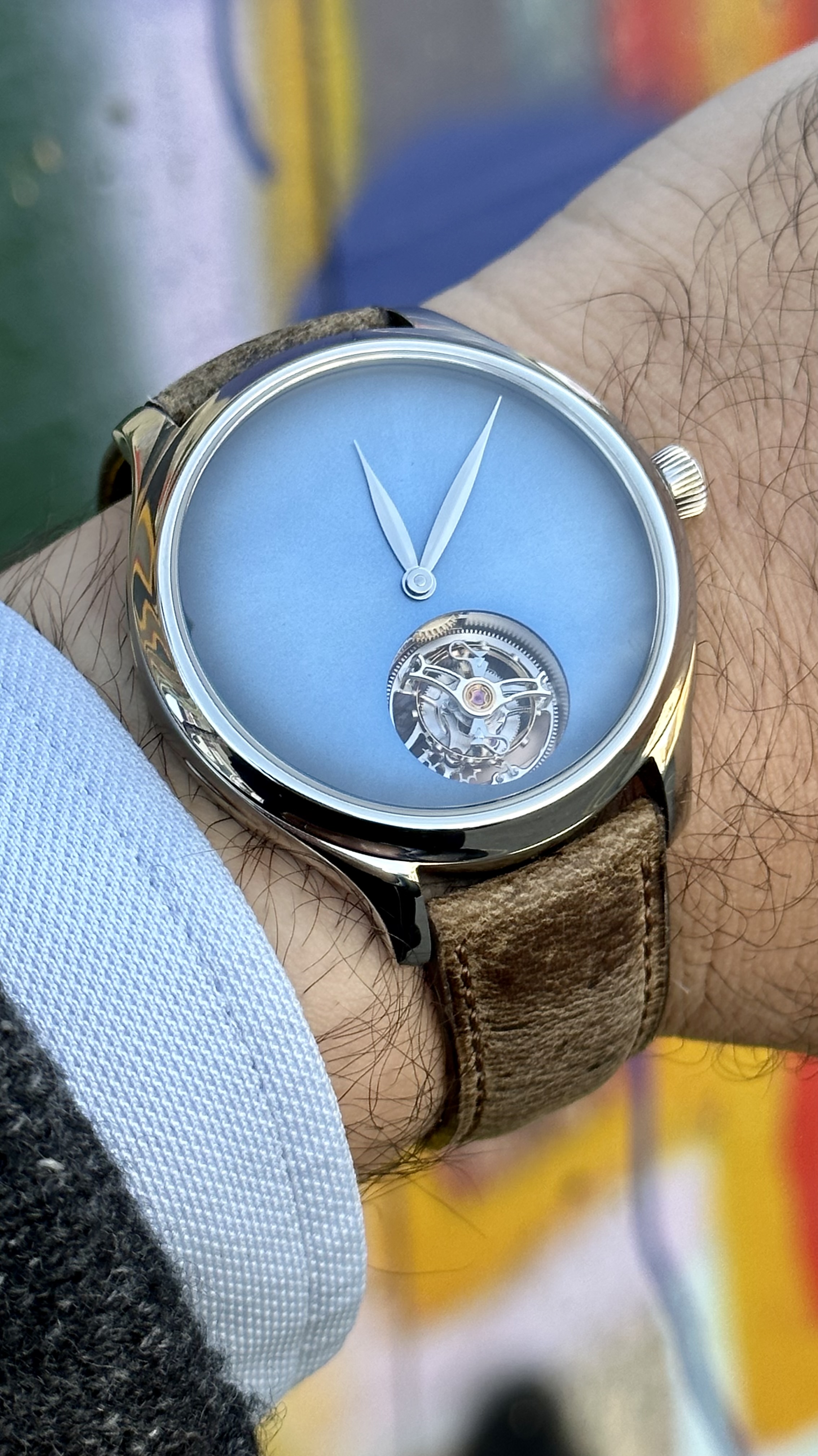 The H. Moser & Cie Endeavour Tourbillon Concept in Funky Blue serves as an exceptional example of a tourbillon that artfully blends time-honored tradition with contemporary technology, all while maintaining a casual and stylish aesthetic.