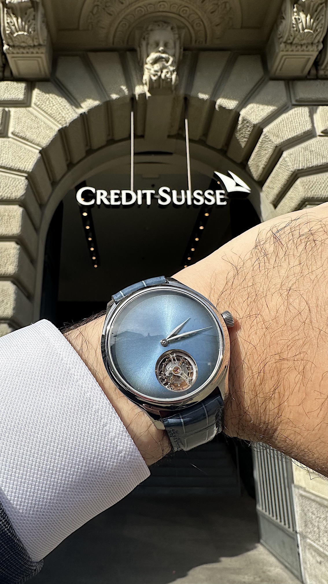 The only suggested improvement for this watch is the strap. We added an alligator strap in a blue jeans color, and it harmonizes perfectly with the dial.