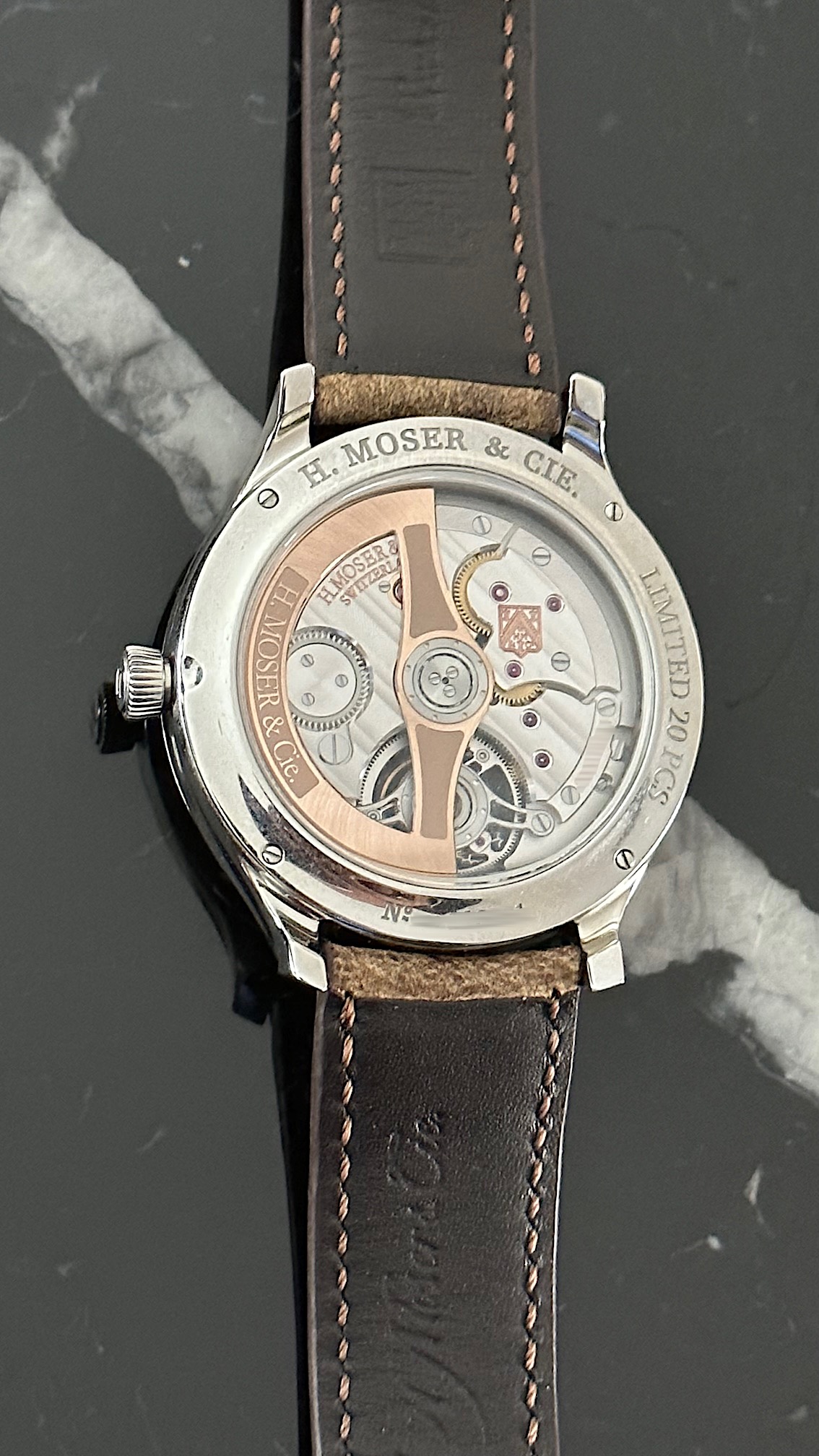Taking center stage on the front is the H. Moser flying tourbillon with a patented double-hairspring.