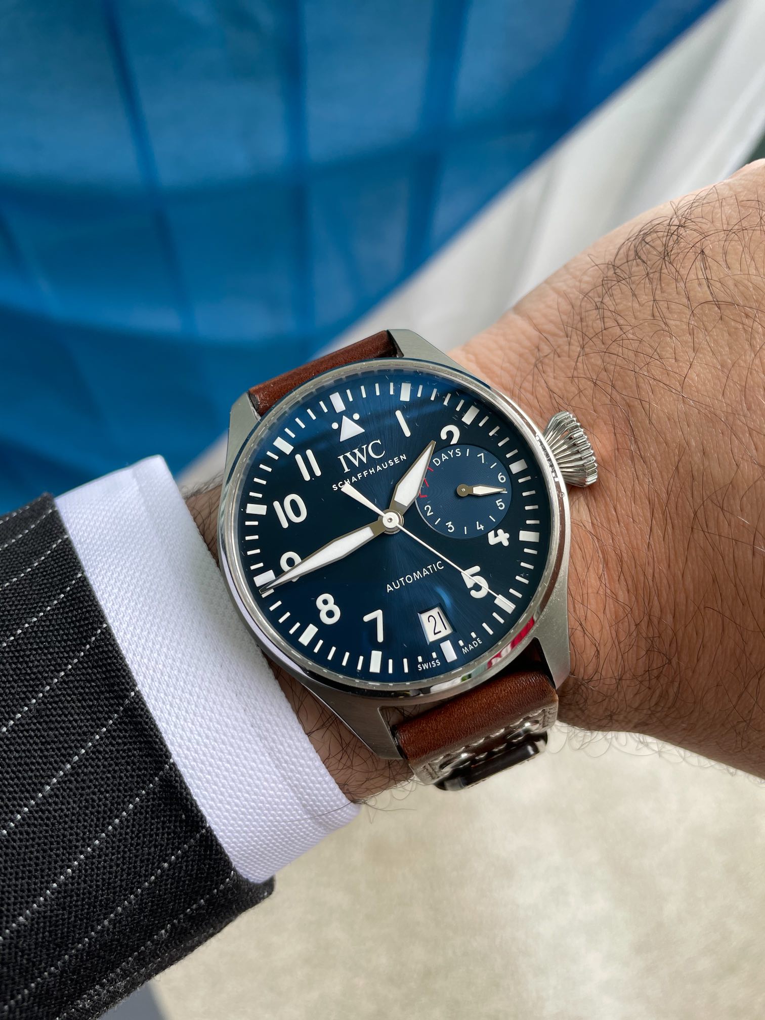 If size is a concern, the new 43mm versions might fit better but, even with a modest wrist, I think that the big pilot makes a statement and is (almost) never out of place.