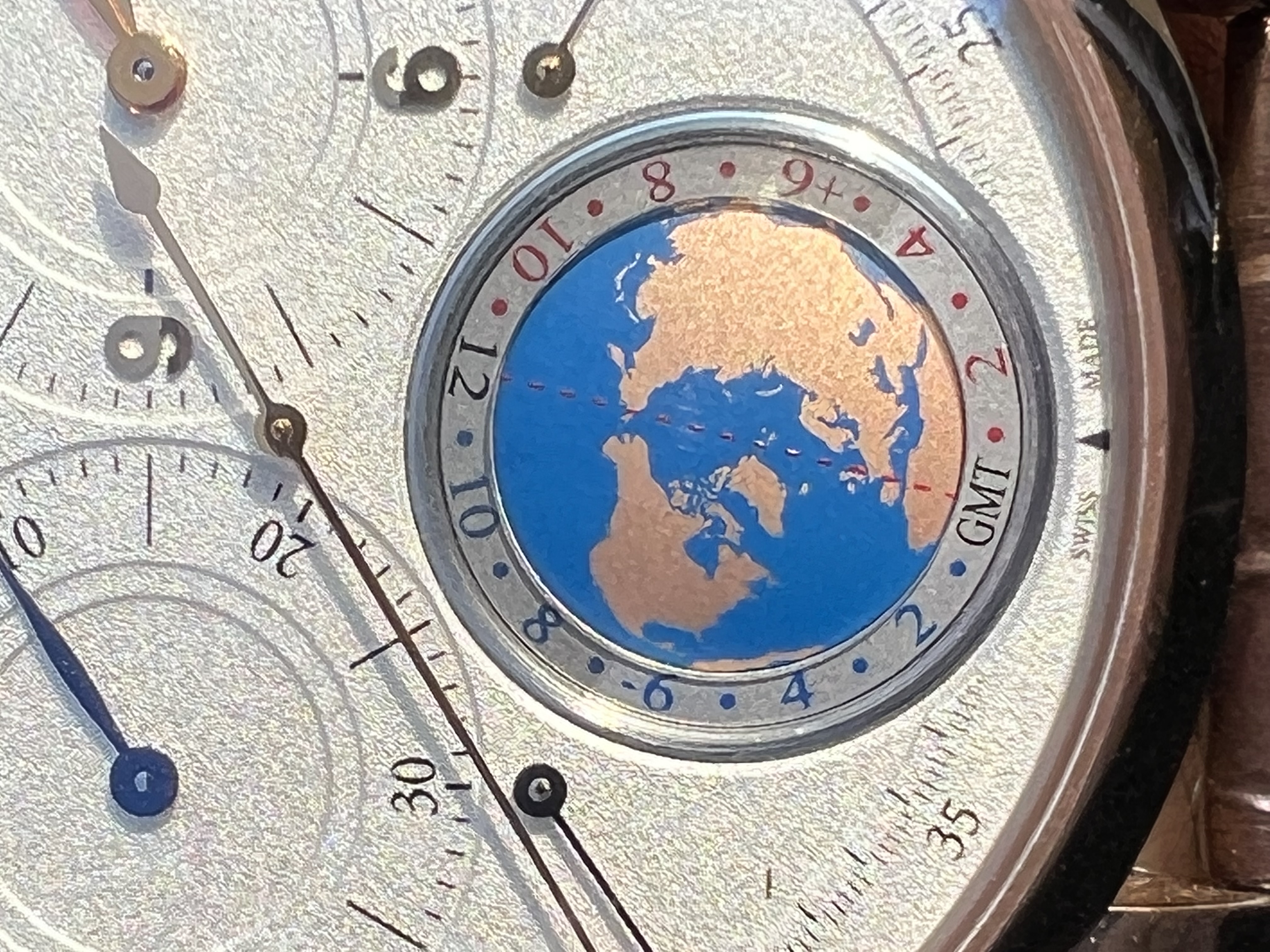 Back to the dial. What about the globe? The pushers to the left allow you to easily change part of the world for the second time zone (the one on the left that features a jump hours for the time). In this photo it is set as GMT +1 for both times but, a simple click on the pushers will move the time of the second time zone and the globe too that will show you in which part of the world you are (or dream to be!). The Silvered grained dial is finished to the highest standards.