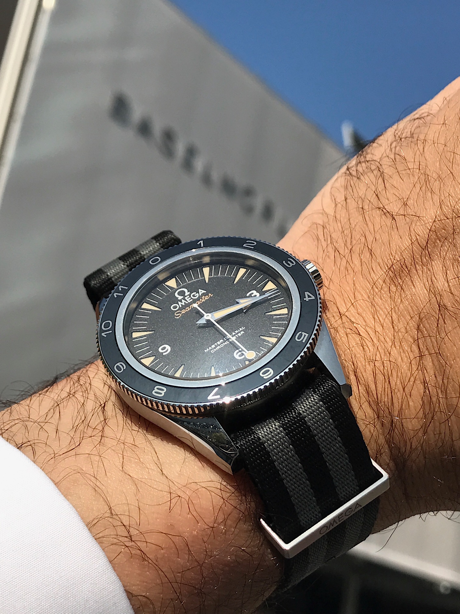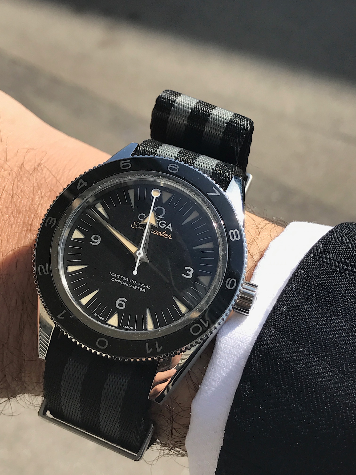 Now this photo alone suggest that this watch is not just another sporty limited edition but the quintessential bond watch (with the revised nato strap in grey and black) that would work very well with a suit. If is good enough for James Bond, it is good enough for the boardroom.