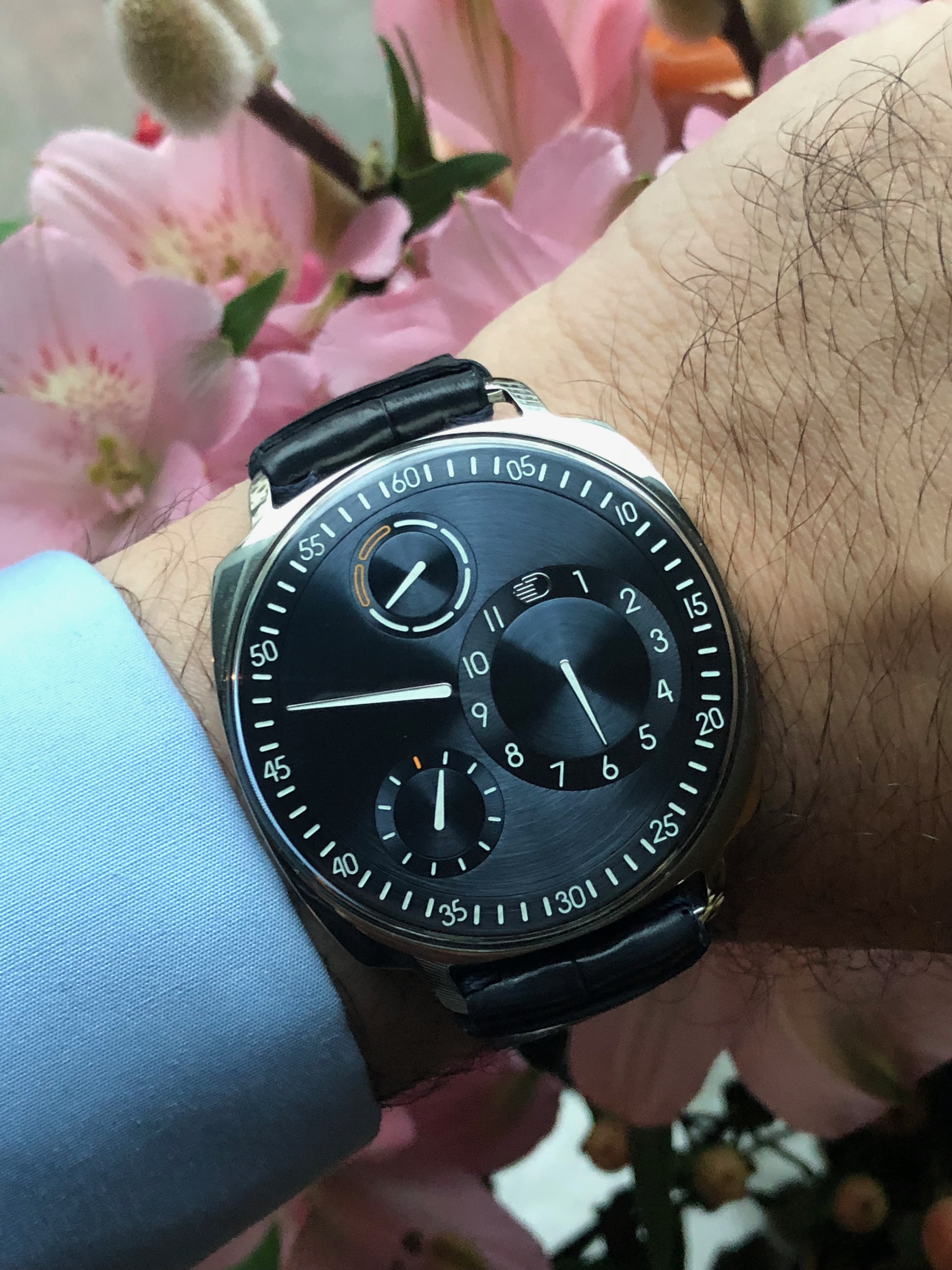 The squared version shares the same DNA of the Type 1 round and other Ressence more complicated watches (Type 3 and Type 5 with an oil-filled system) that is essentially the patented ROCS system (Ressence Orbital Convex System). In short the position of the 3 discs is rotating creating a different layout depending on the hour.