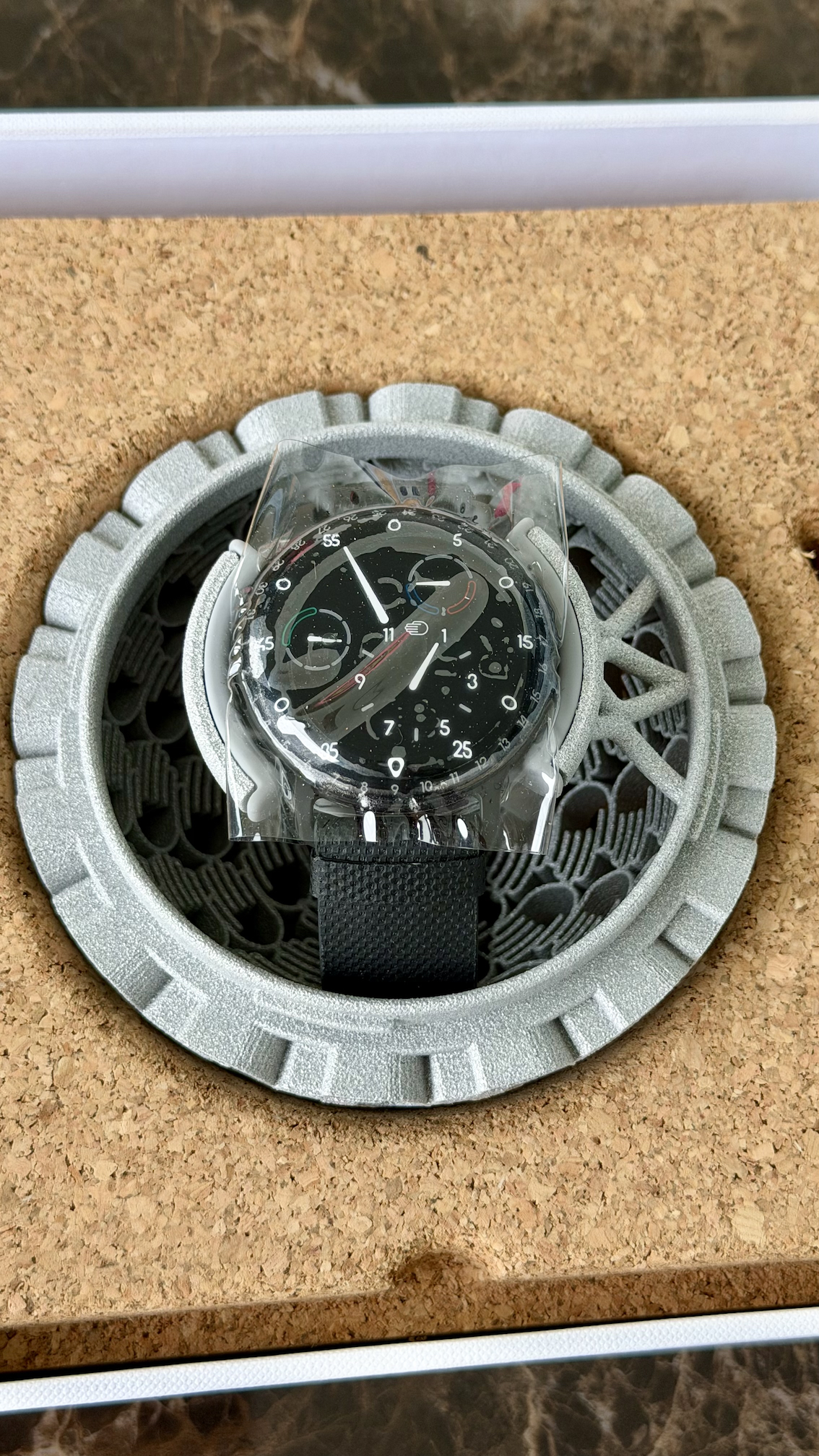The watch arrives in Ressence's distinctive 3D-printed box that opens with a rotation—a tactile preview of the crownless setting mechanism to come. At 44mm in diameter and 15mm in height, the Type 3 BB2 wears like a perfectly smooth, dark pebble shaped by time and water.