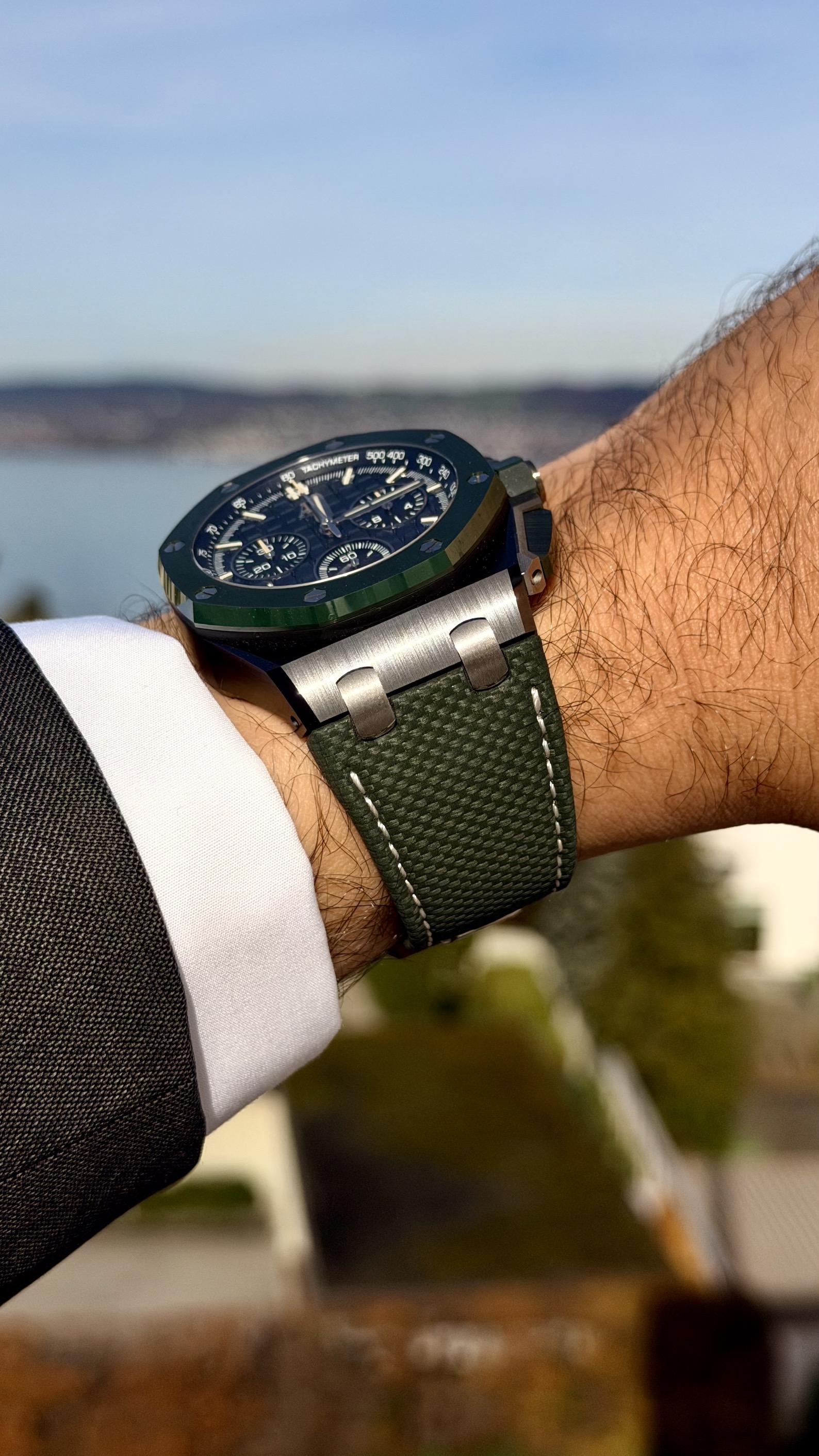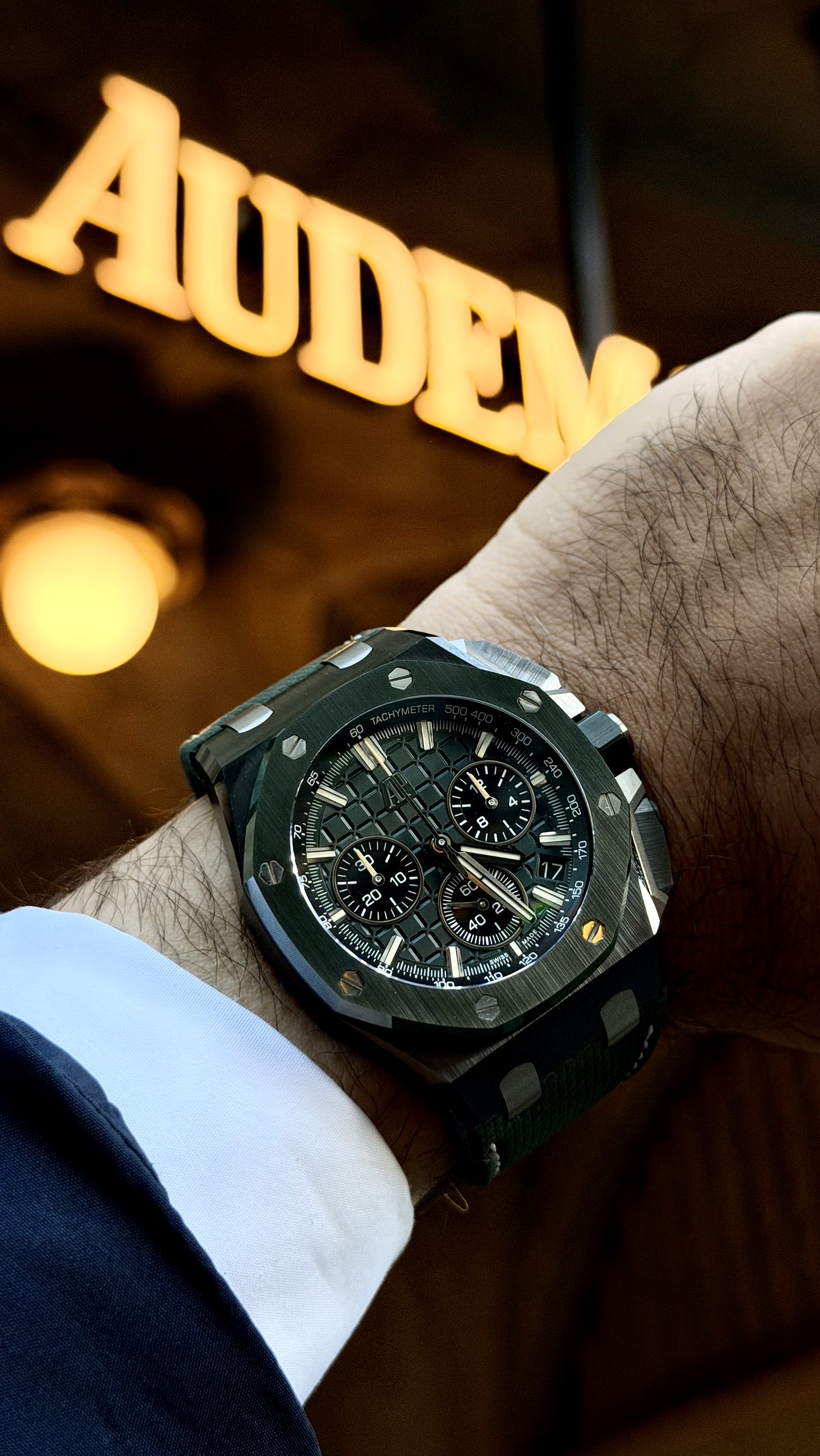 I visited the local AP house without looking for a specific watch but to check what was available a few years after the "old sold out" market hype for anything Audemars. I had the chance to try a few Code 11.59 watches—which could be seen as charming in their own right—but also a few Royal Oak Offshores that were available for purchase. The Audemars Piguet Royal Oak Offshore Ref. 26420CE.OO.A063VE.01 caught my eye immediately as the black ceramic case combined with the forest dark green makes the watch appear more understated and somehow smaller. I loved the look and, comparing it with the 42mm, it appears more comfortable thanks to the new case construction that is slightly curved and fits better on the wrist. The all-ceramic chronograph pushers remind me of the construction of the AP concept watches—so much more futuristic than the historic 42mm.