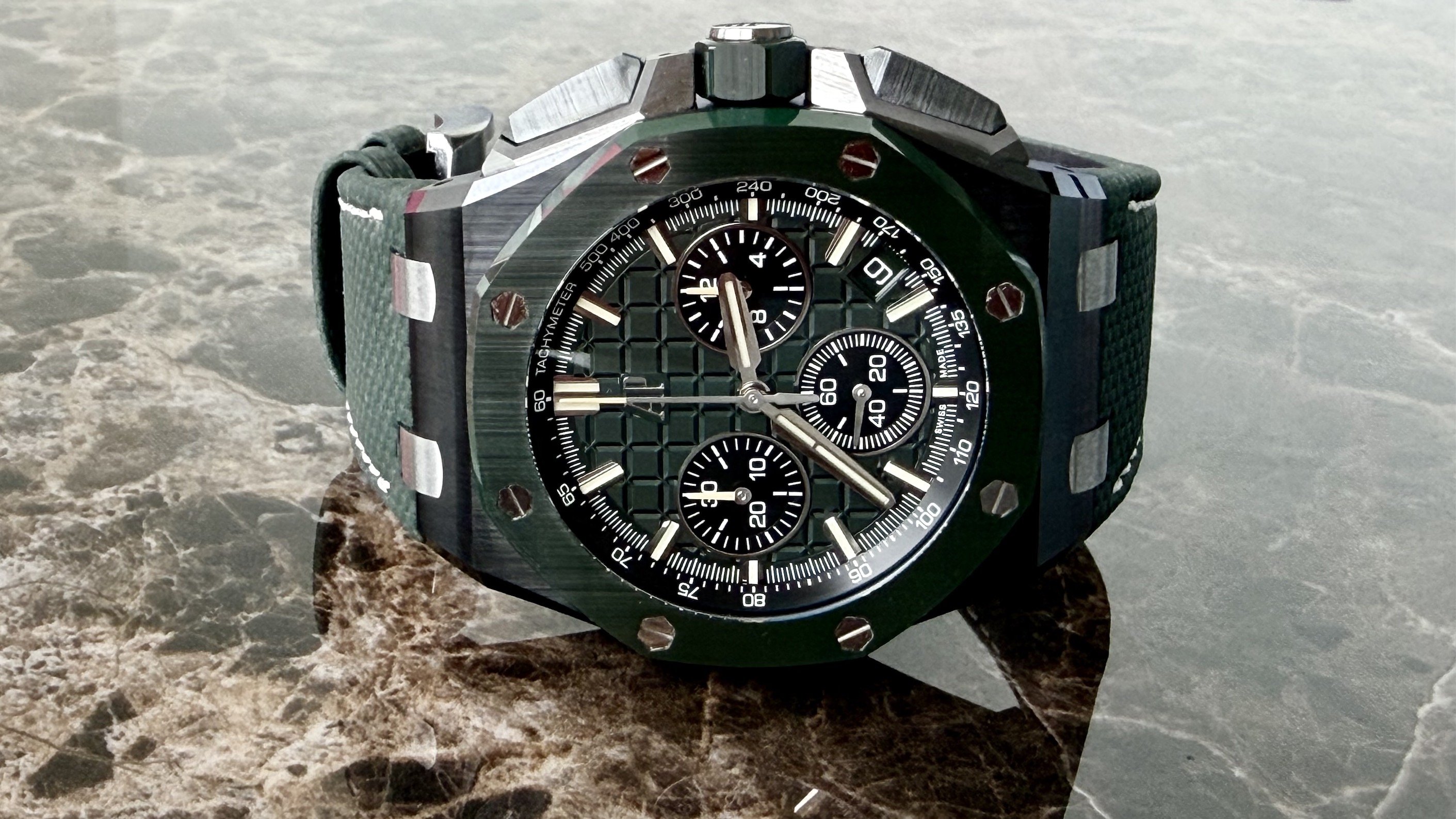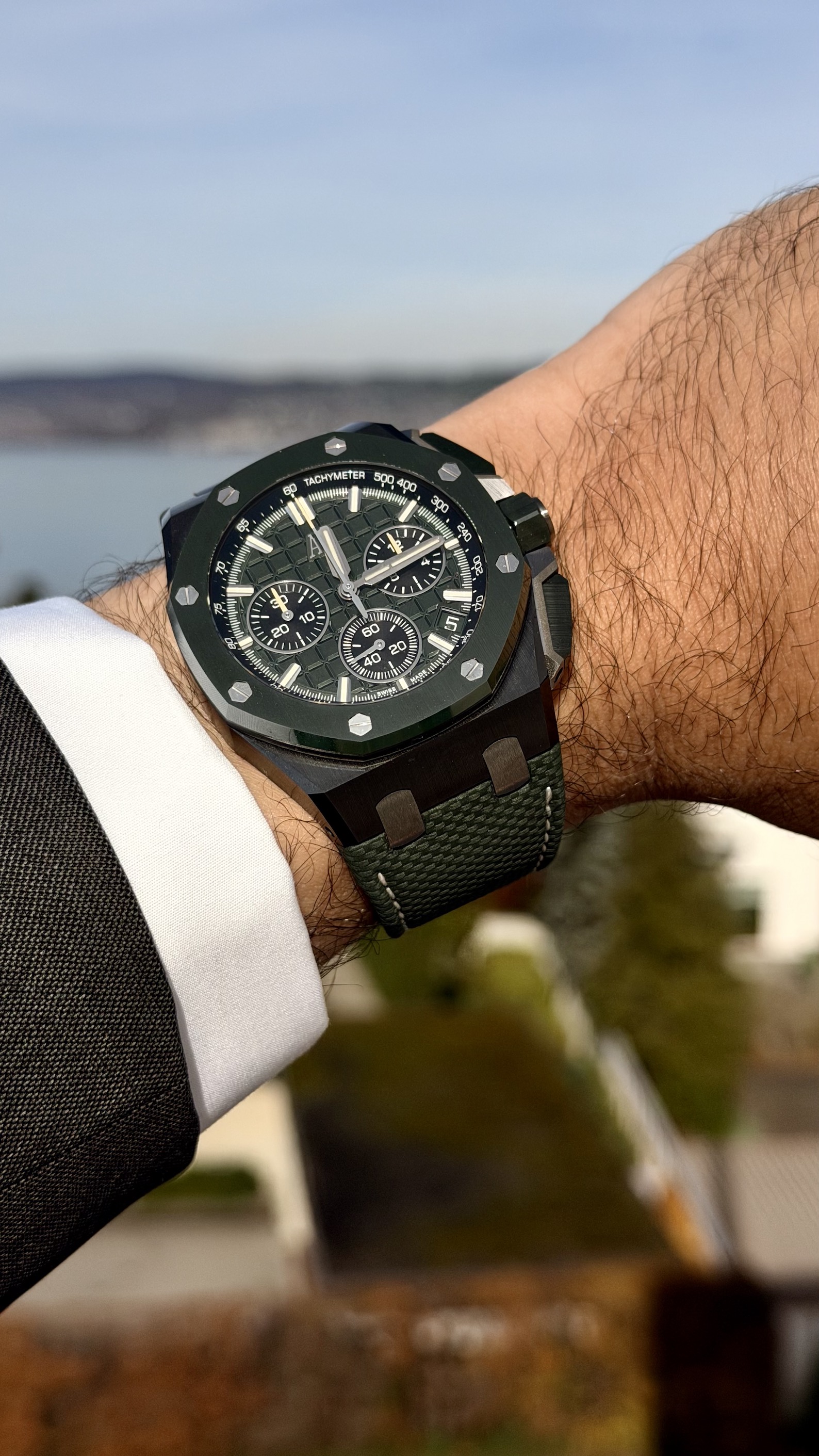I visited the local AP house without looking for a specific watch but to check what was available a few years after the "old sold out" market hype for anything Audemars. I had the chance to try a few Code 11.59 watches—which could be seen as charming in their own right—but also a few Royal Oak Offshores that were available for purchase. The Audemars Piguet Royal Oak Offshore Ref. 26420CE.OO.A063VE.01 caught my eye immediately as the black ceramic case combined with the forest dark green makes the watch appear more understated and somehow smaller. I loved the look and, comparing it with the 42mm, it appears more comfortable thanks to the new case construction that is slightly curved and fits better on the wrist. The all-ceramic chronograph pushers remind me of the construction of the AP concept watches—so much more futuristic than the historic 42mm.