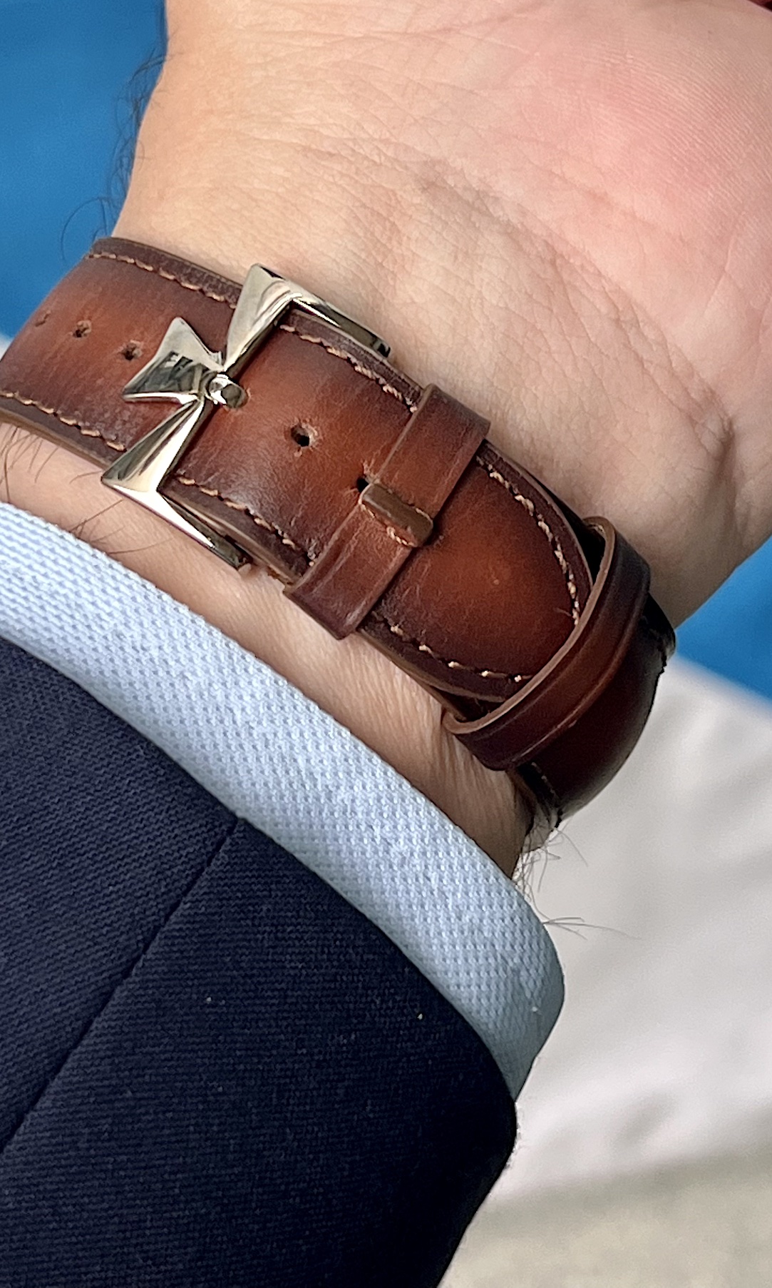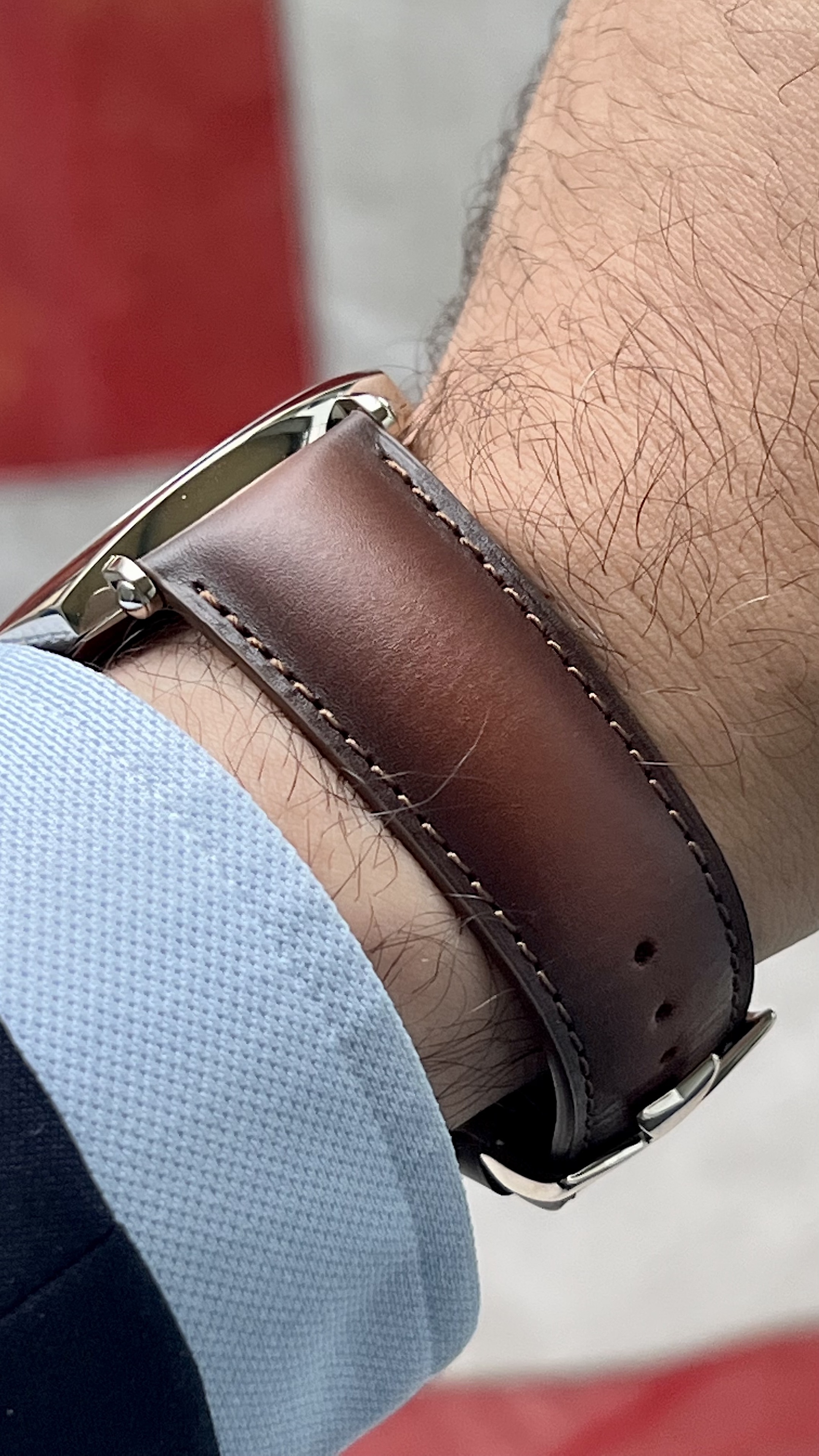 Things get more exciting with the new strap, hand-made in Milano by Serapian. It is a faded brown that looks great both in formal and informal settings: