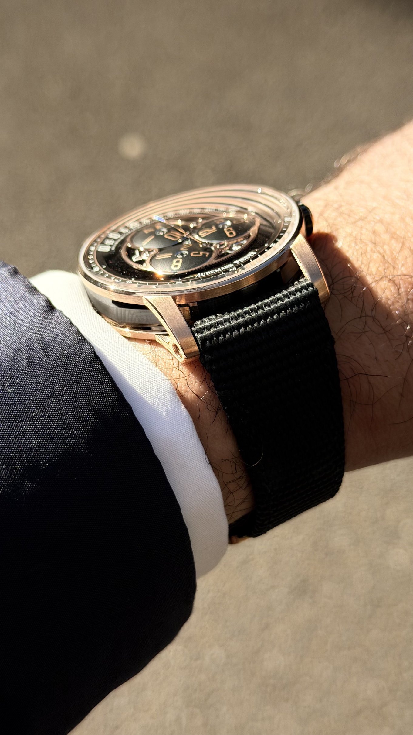 I wore the Code 11.59 Starwheel with a dark navy suit and it felt absolutely at home. The black textile strap—with its woven fabric texture—pairs perfectly with the ceramic and pink gold case, lending the watch an understated elegance that works equally well in a business setting or a more casual environment. The folding clasp is secure and easy to operate.