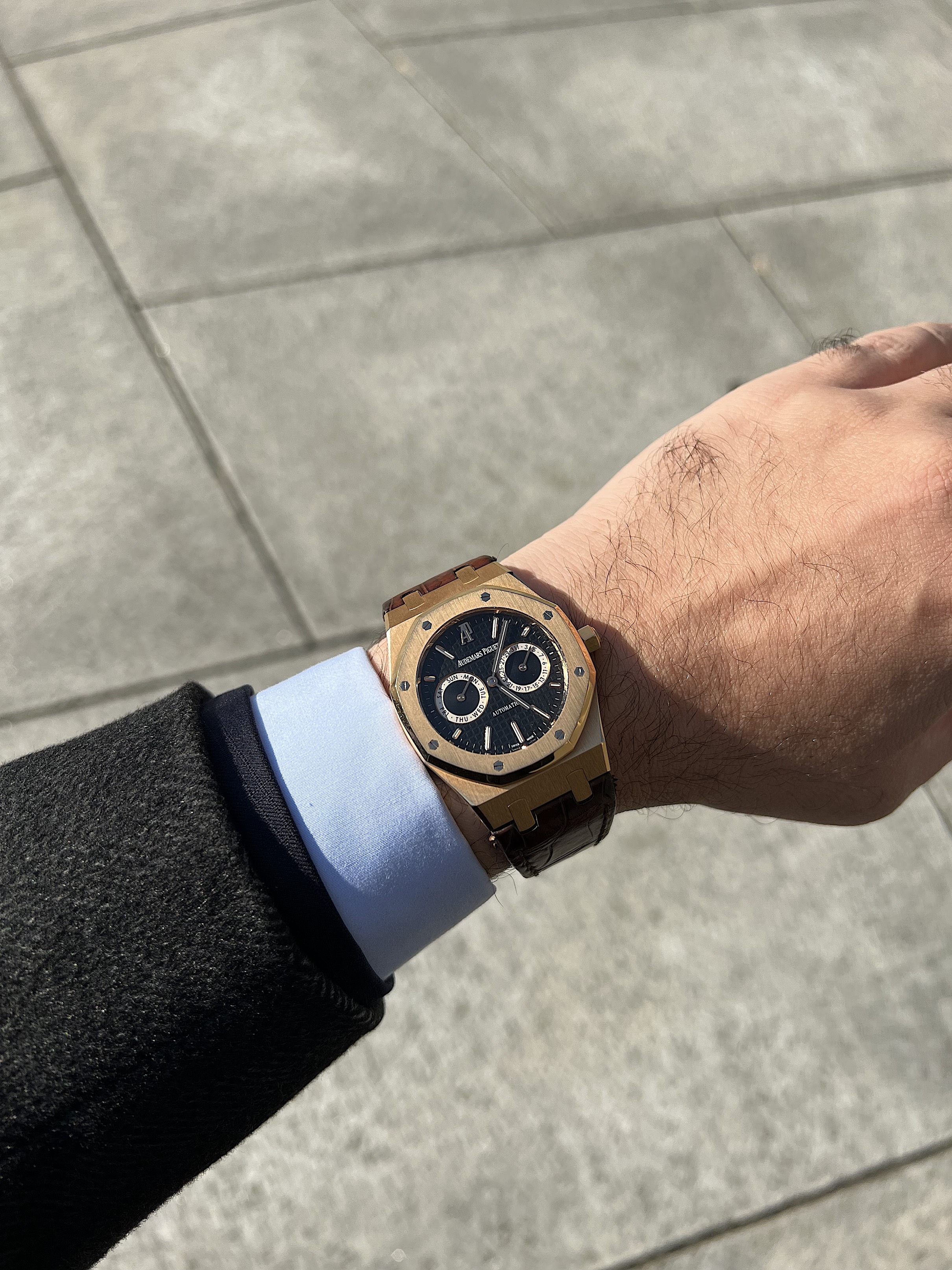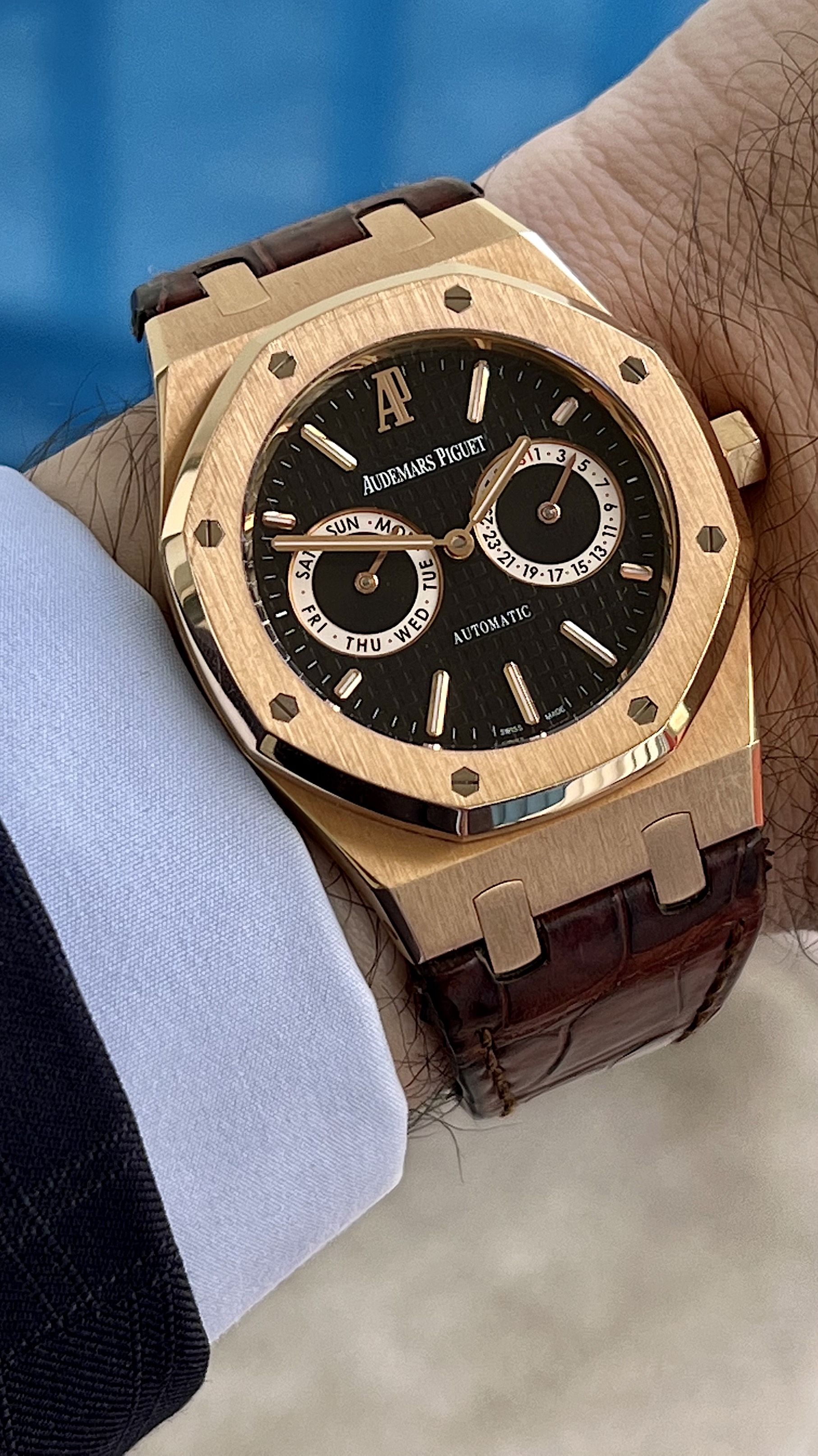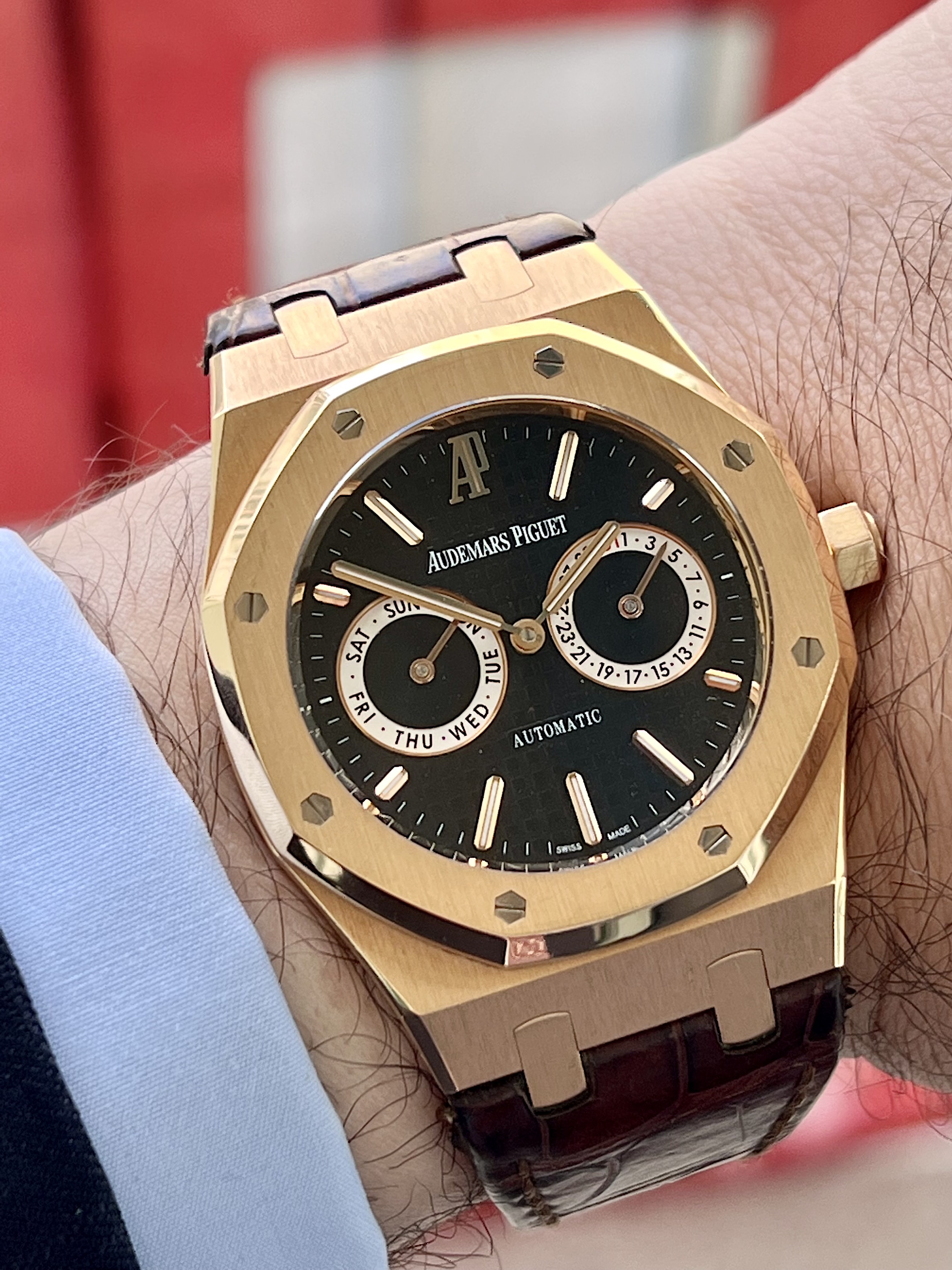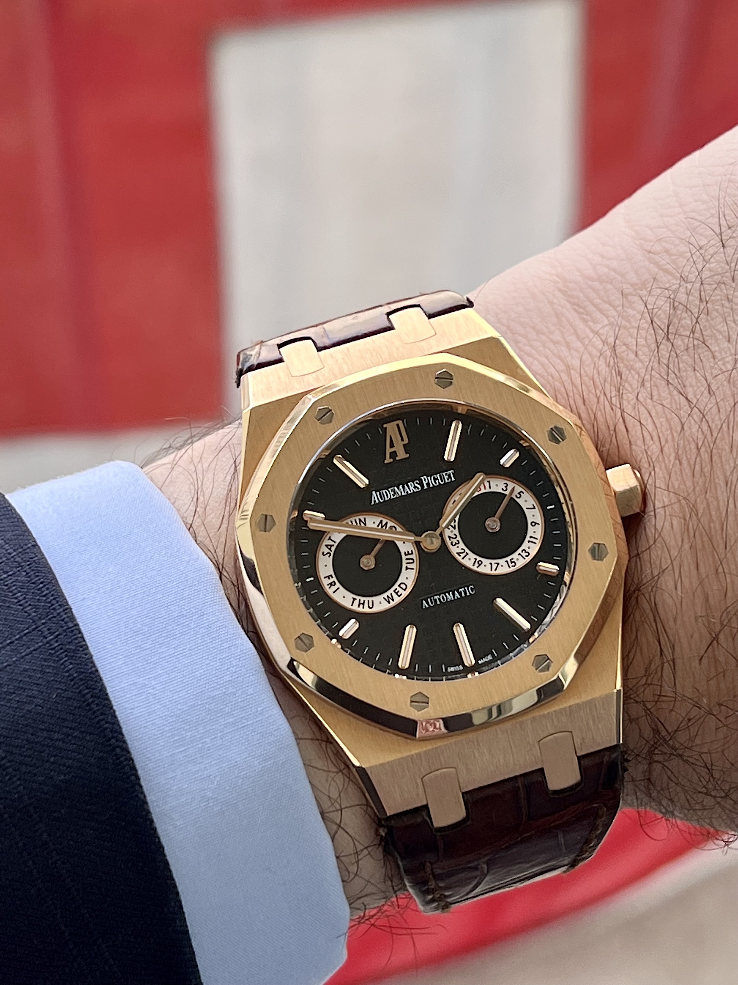 After almost 10 years since it was discontinued this remains, without doubts, one of the most elegant Royal Oak modesl in rose gold. The 39mm size wears very well even on smaller wrists and the thin case ensures that it can fit well under the shirt cuffs.
