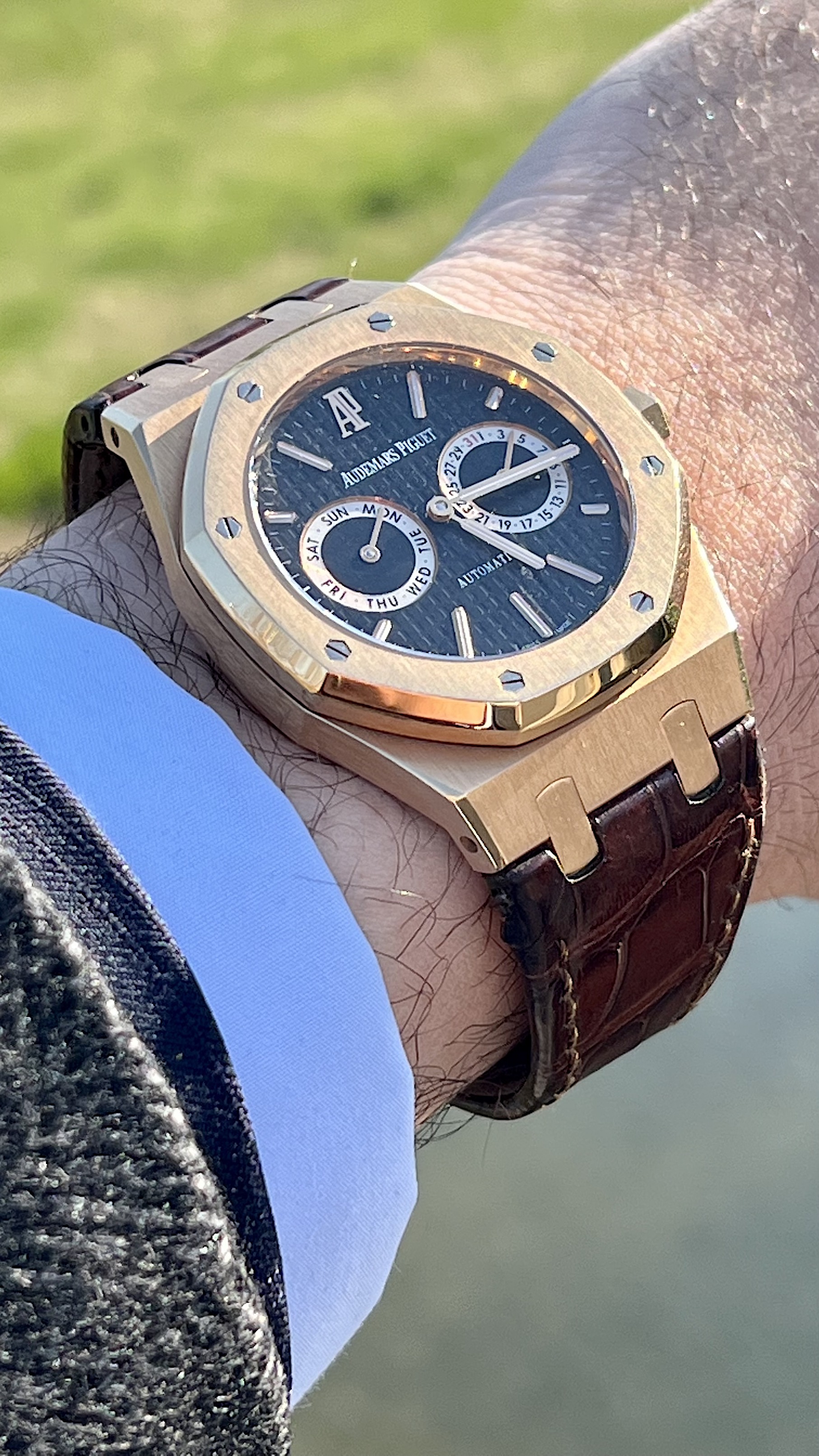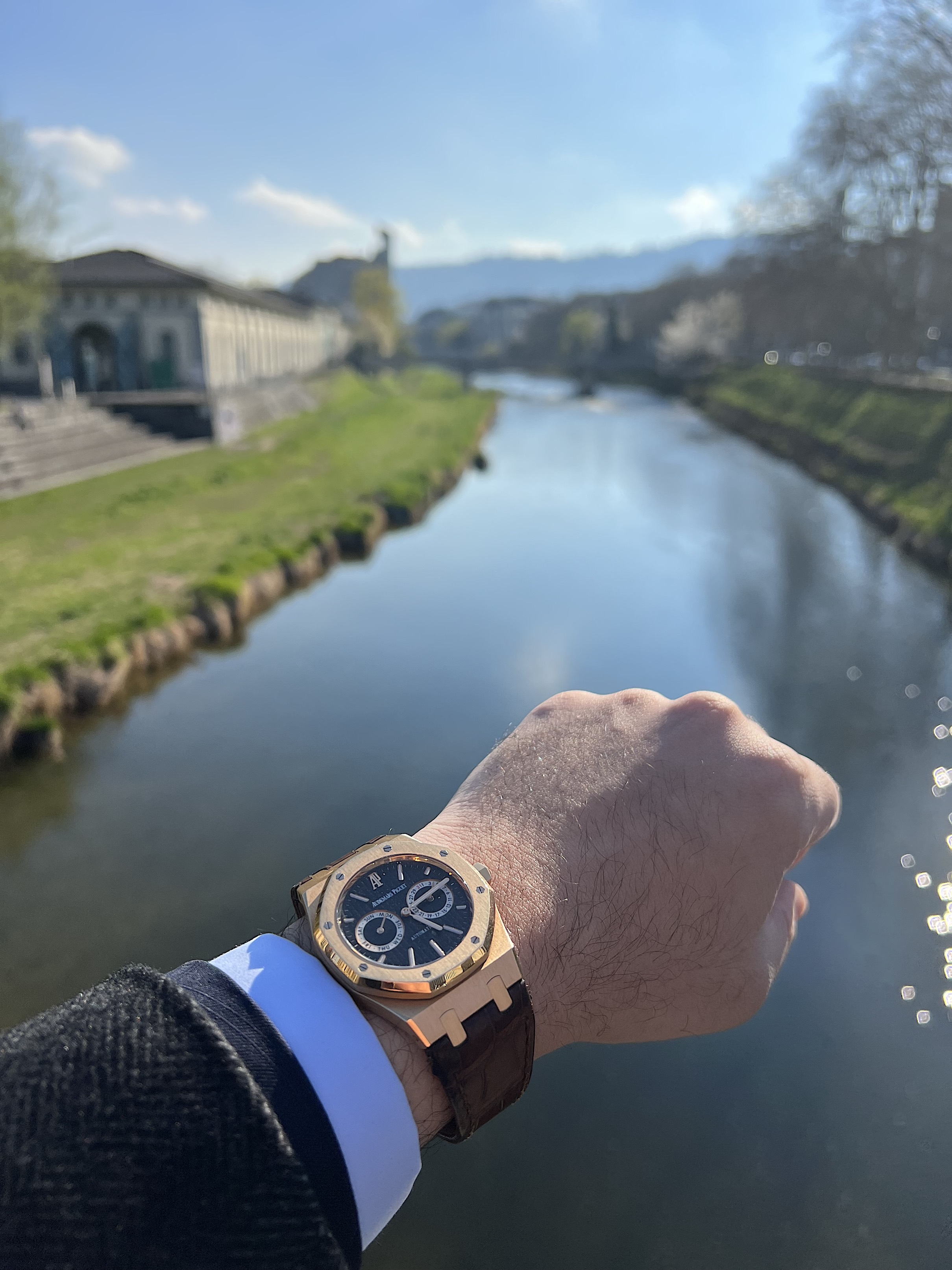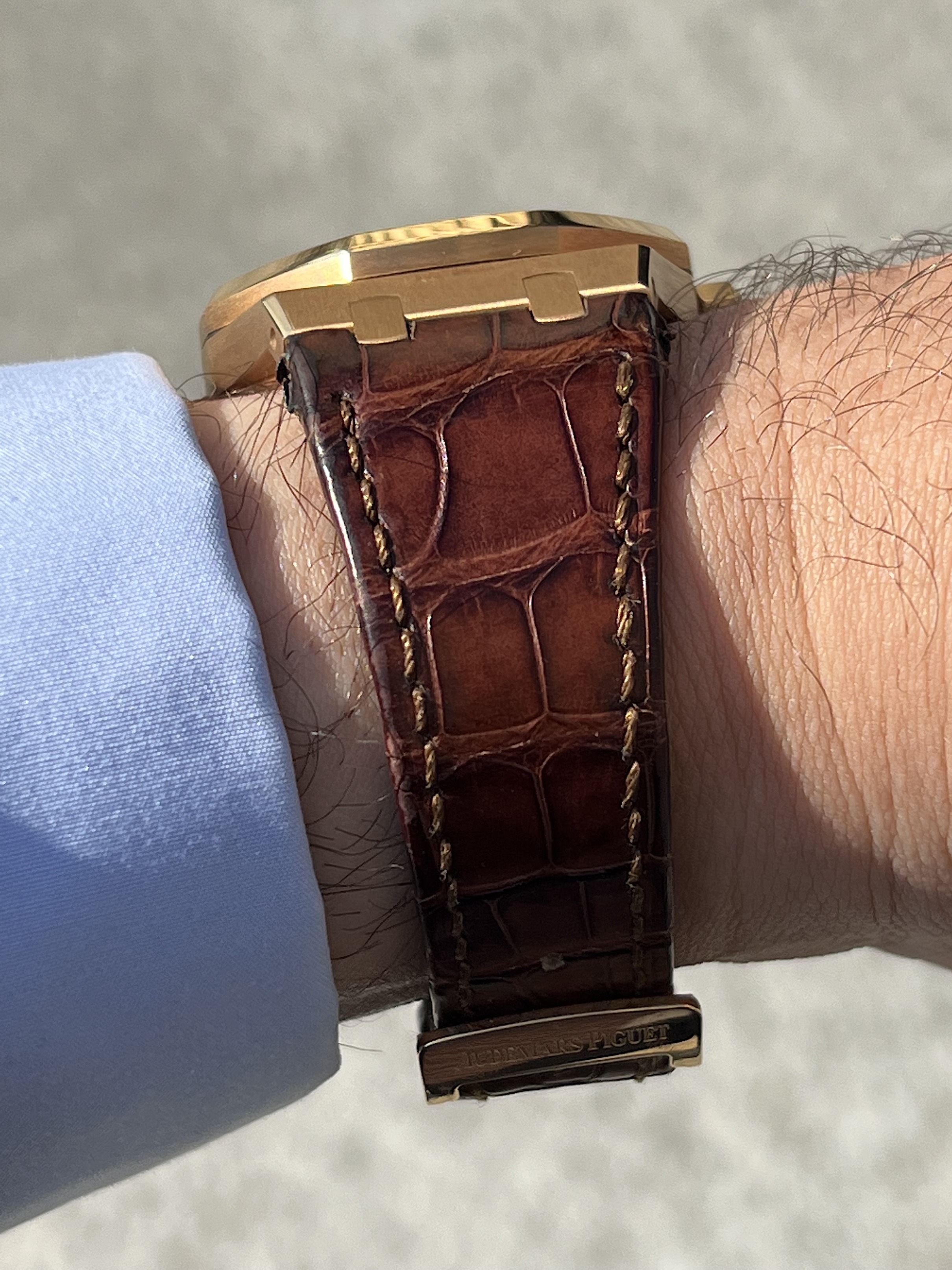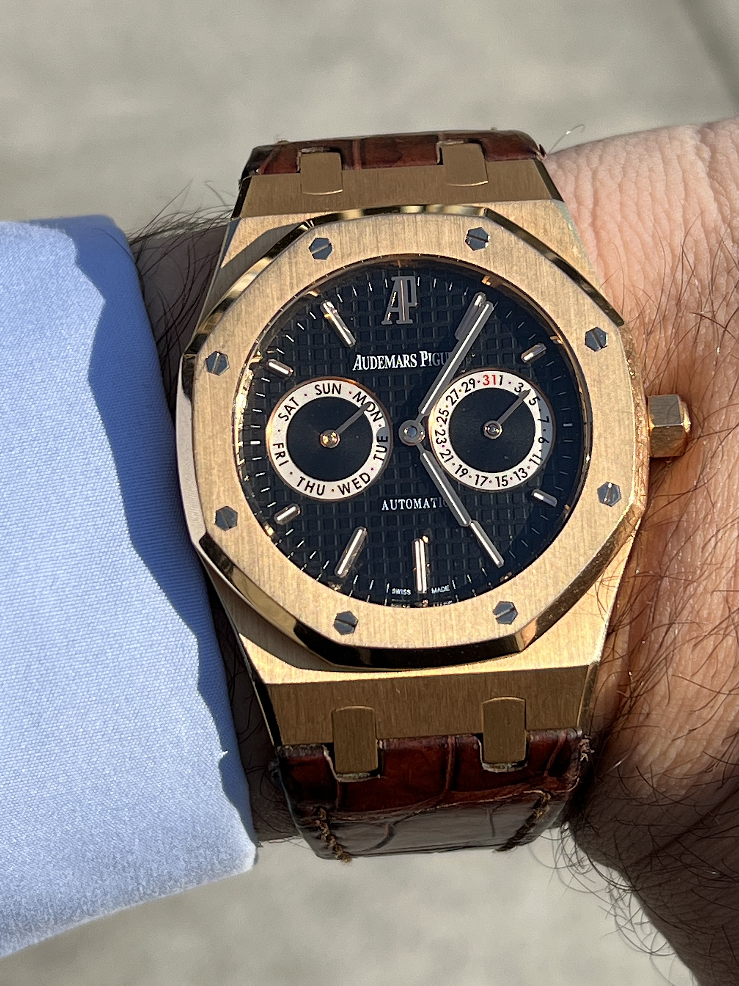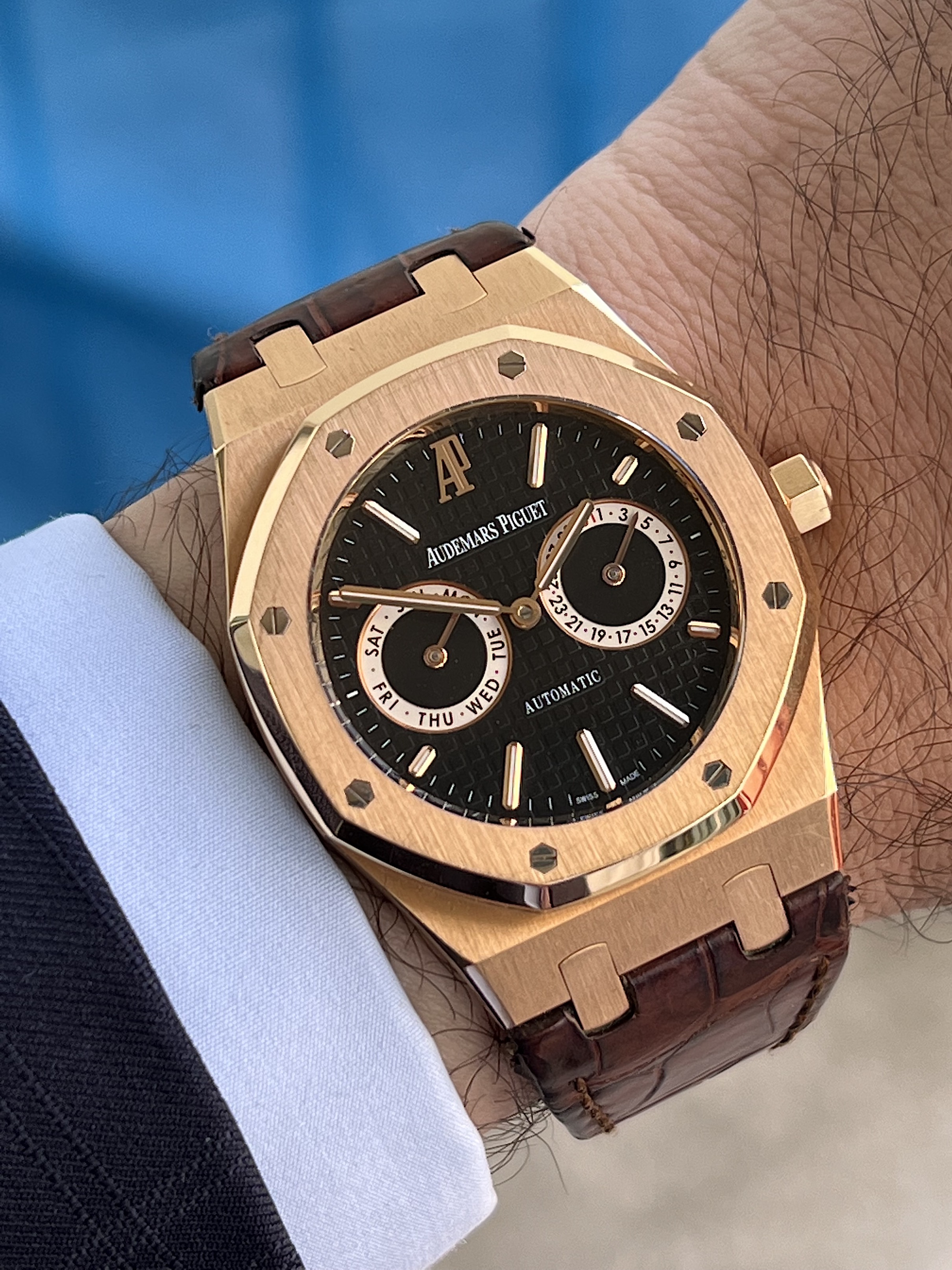 After almost 10 years since it was discontinued this remains, without doubts, one of the most elegant Royal Oak modesl in rose gold. The 39mm size wears very well even on smaller wrists and the thin case ensures that it can fit well under the shirt cuffs.
