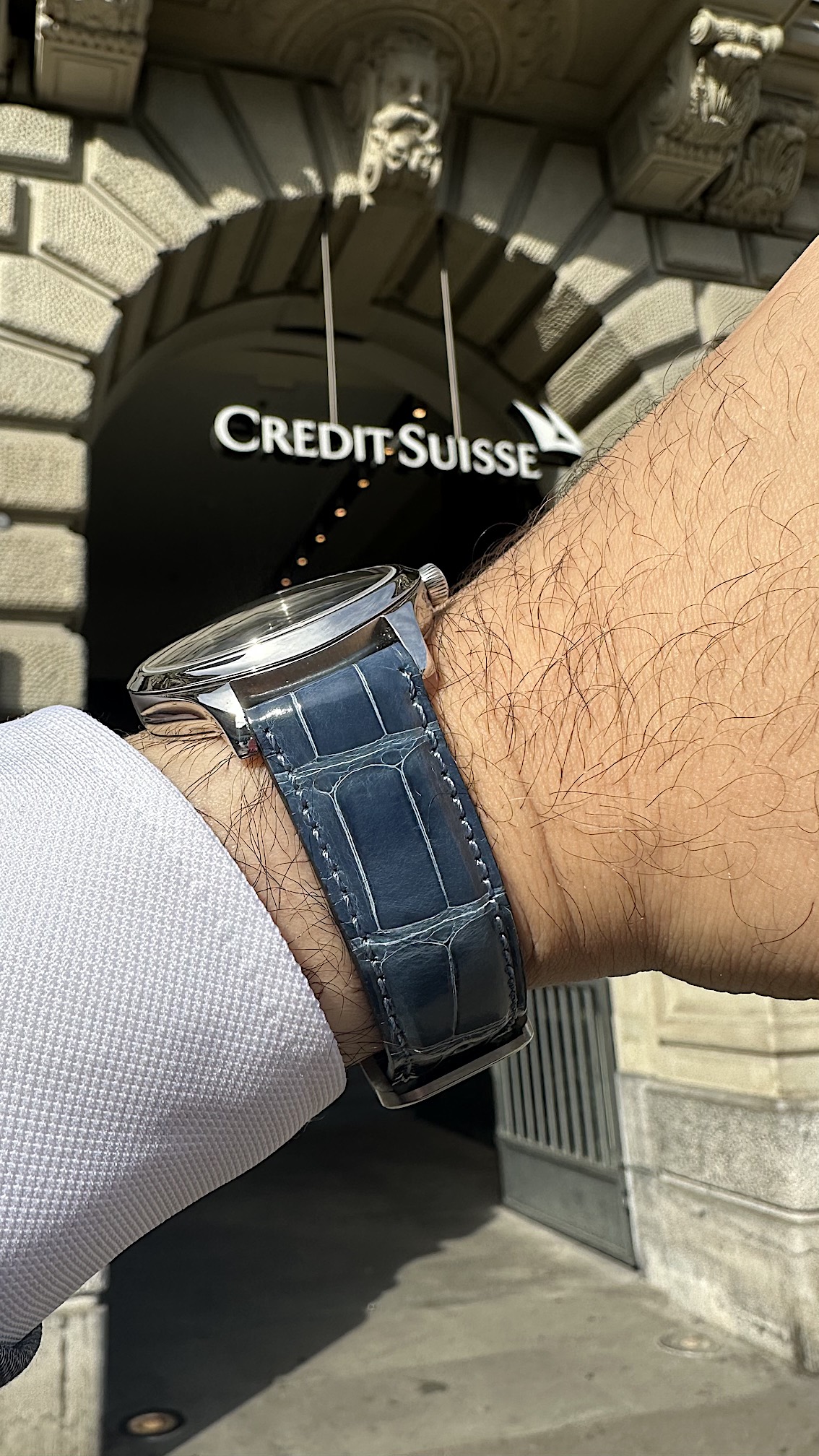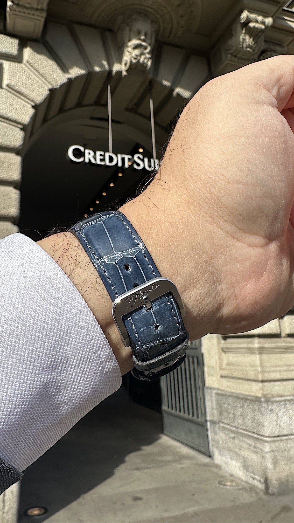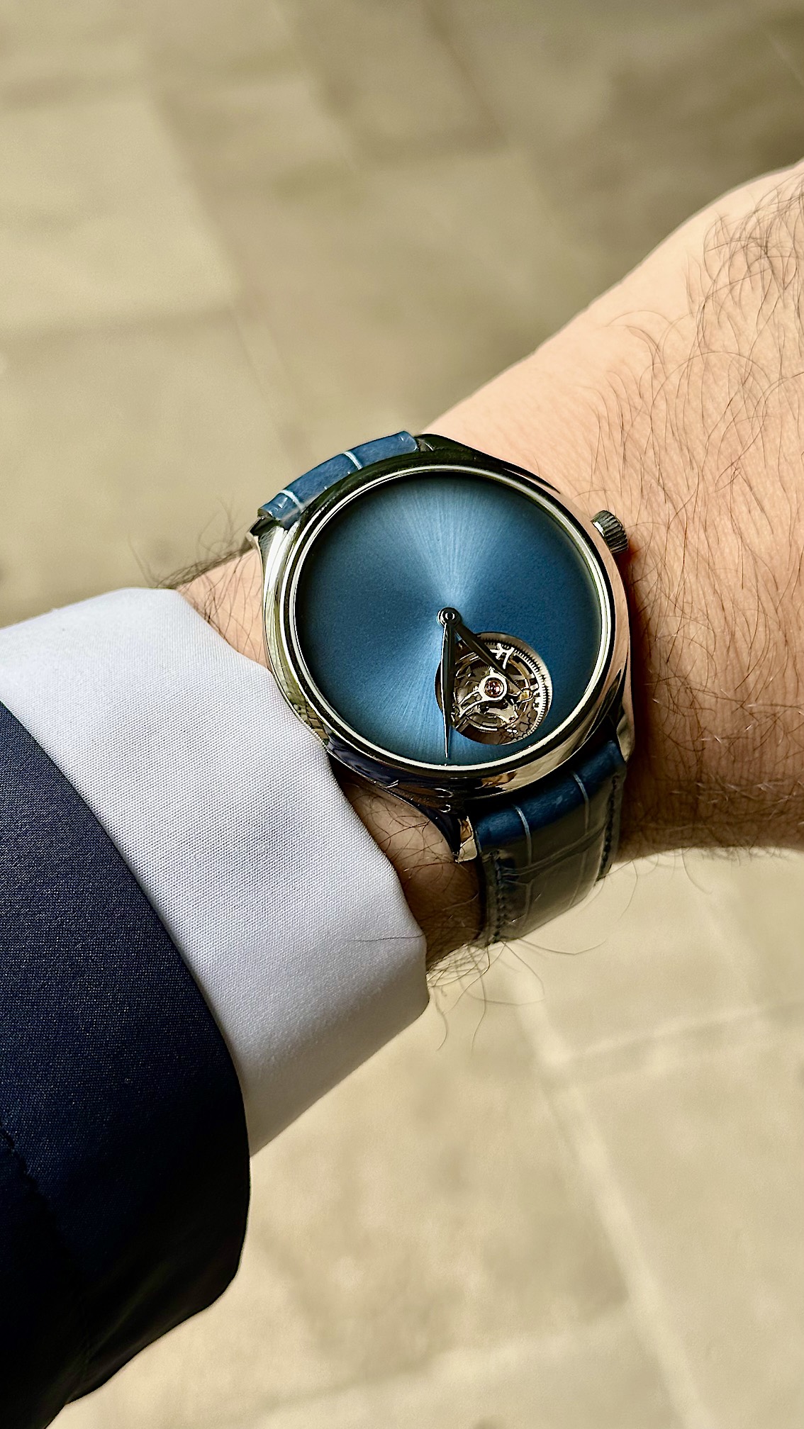 The only suggested improvement for this watch is the strap. We added an alligator strap in a blue jeans color, and it harmonizes perfectly with the dial.