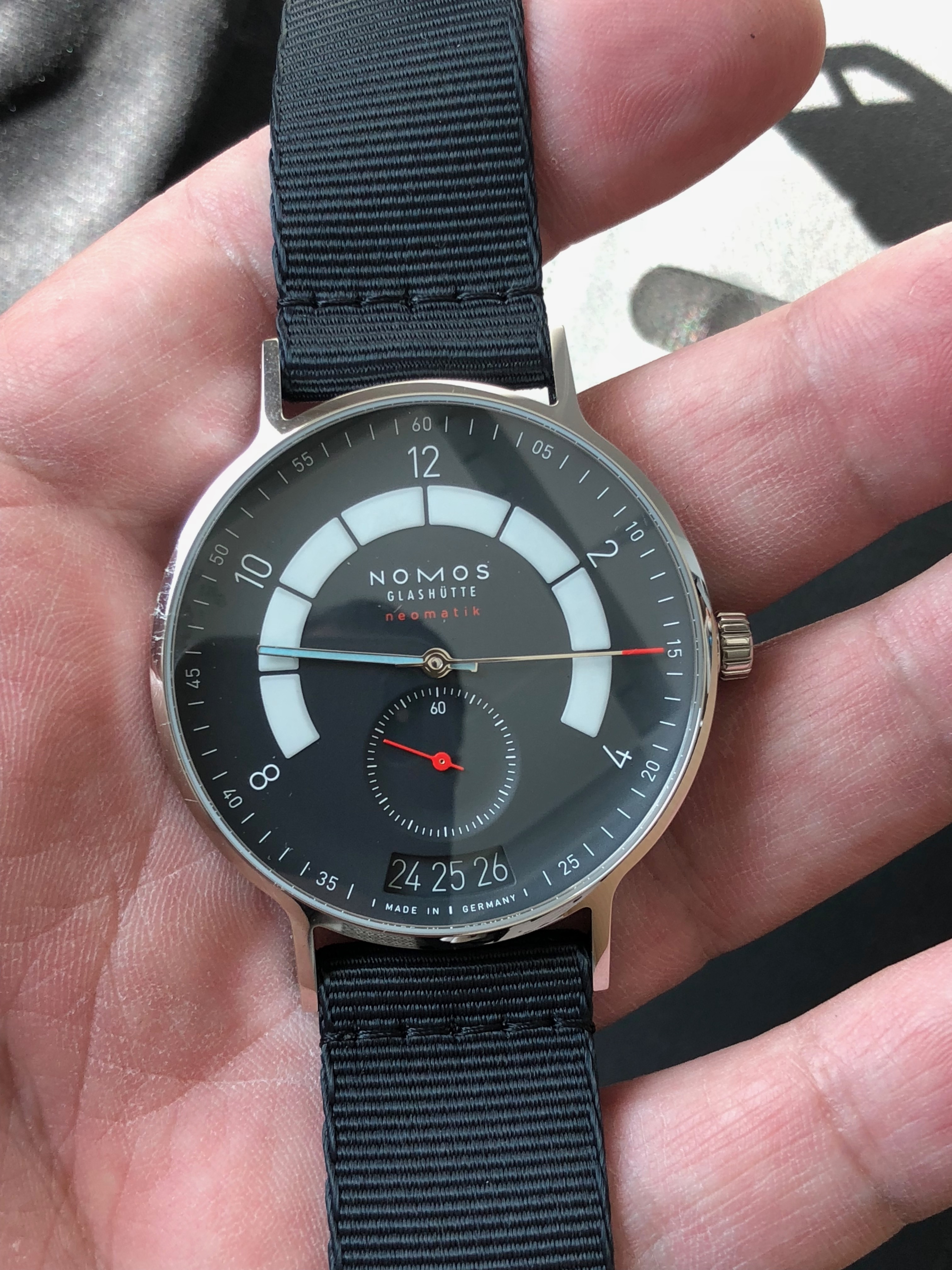 The online retailer Mr Porter launched the Nomos Autobahn the same day it was announced in Basel and as a result of this ??ber fast launch we now have one of the firsts Nomos Autobahn to hit the market. In case you wonder yes we will be visiting Baselworld wearing a watch announced there!