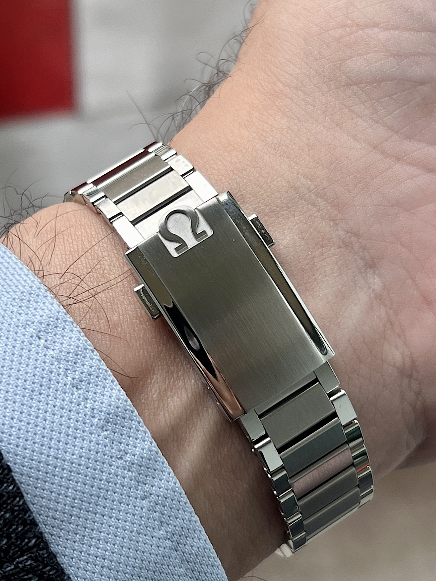 The bracelet is also different and very comfortable. Is very similar to the Apollo 11 50th Anniversary watch with thin links. The clasp uses the historic omega logo.