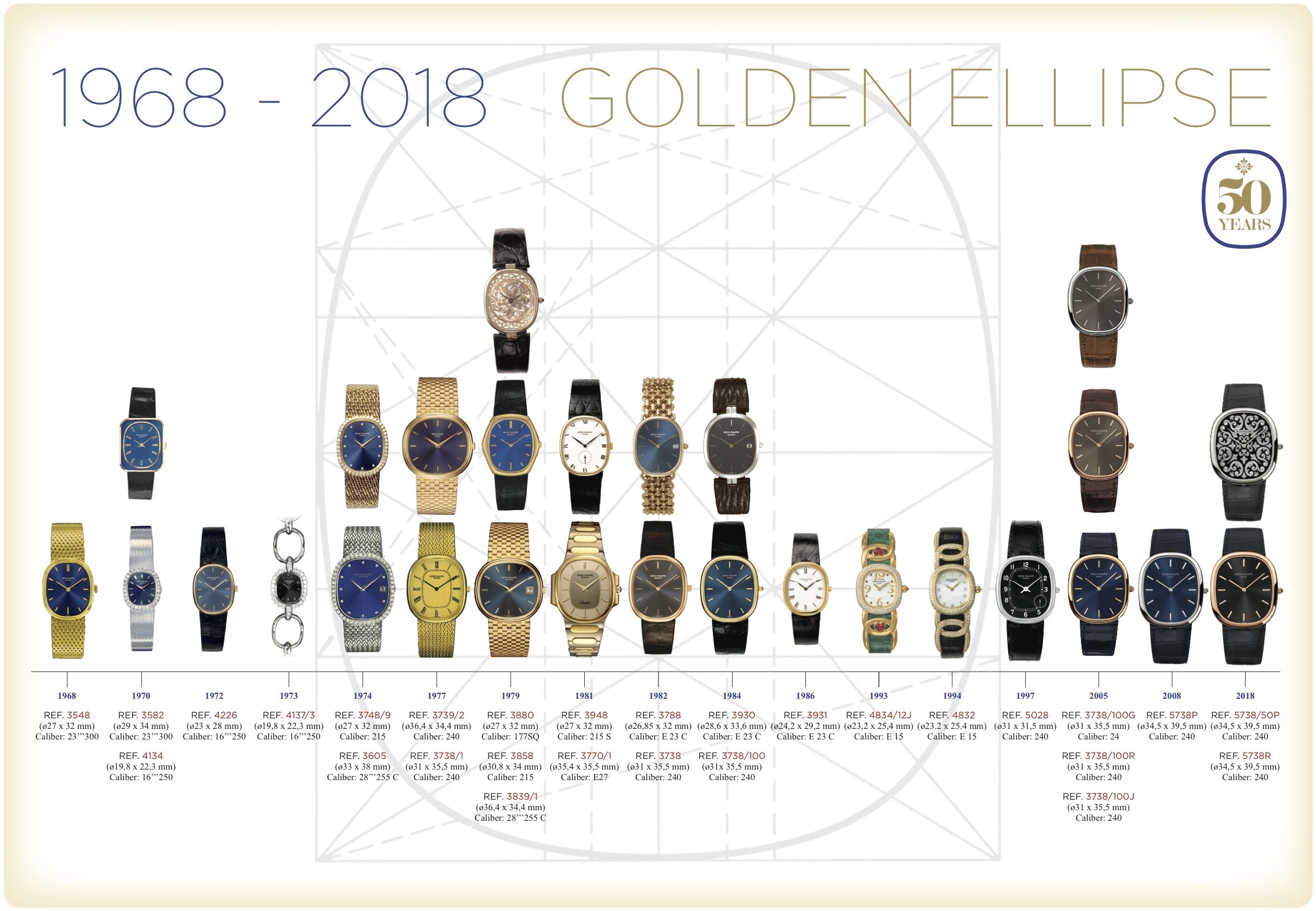 As we can see in the above graphic there are various iterations with the last launched in 2018 for the 50th anniversary of the golden ellipse. The current model is powered by the same caliber but has a bigger case with dimensions: 34.5 x 39.5 mm. Height: 5.9 mm.