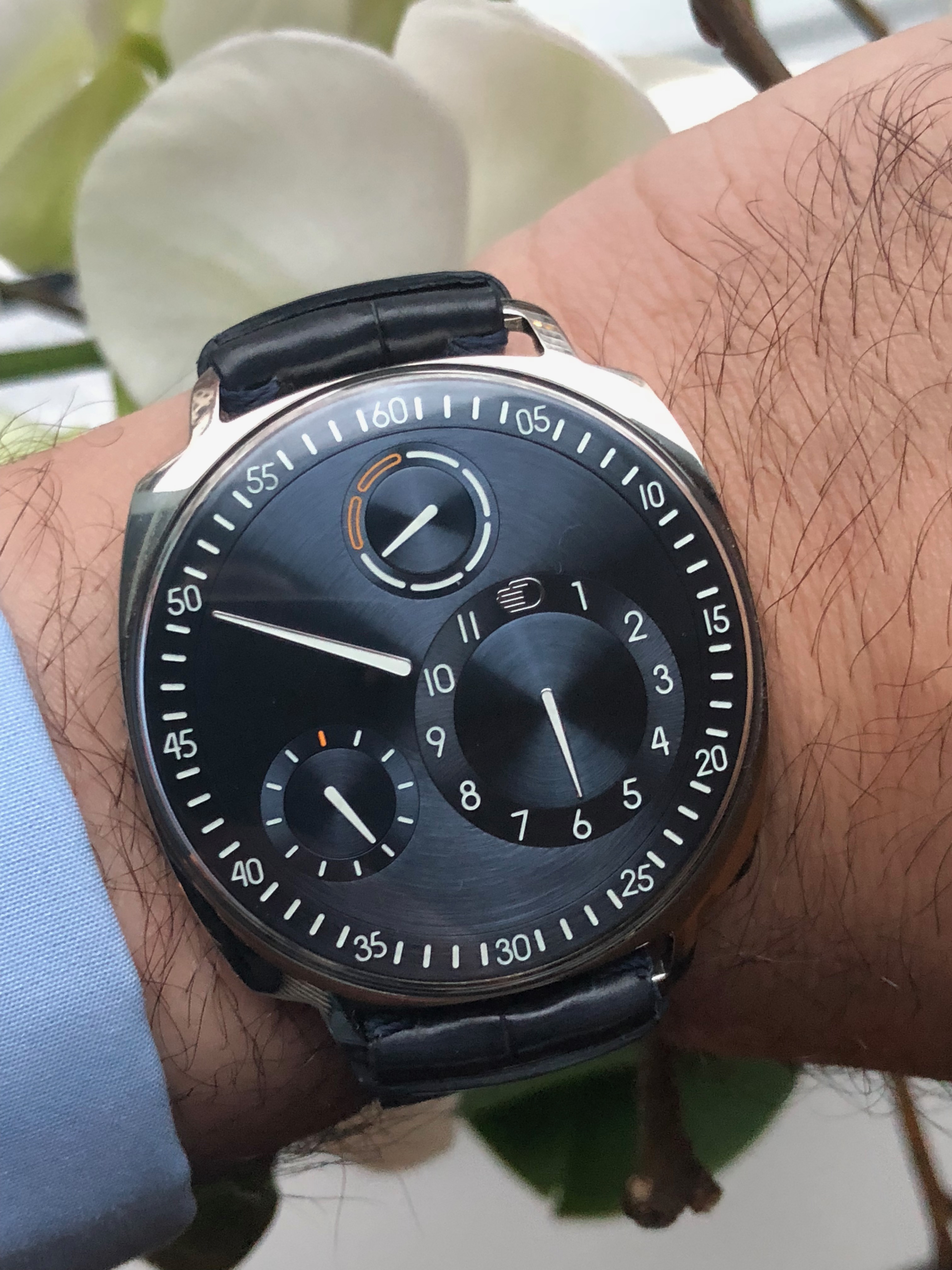 The squared version shares the same DNA of the Type 1 round and other Ressence more complicated watches (Type 3 and Type 5 with an oil-filled system) that is essentially the patented ROCS system (Ressence Orbital Convex System). In short the position of the 3 discs is rotating creating a different layout depending on the hour.