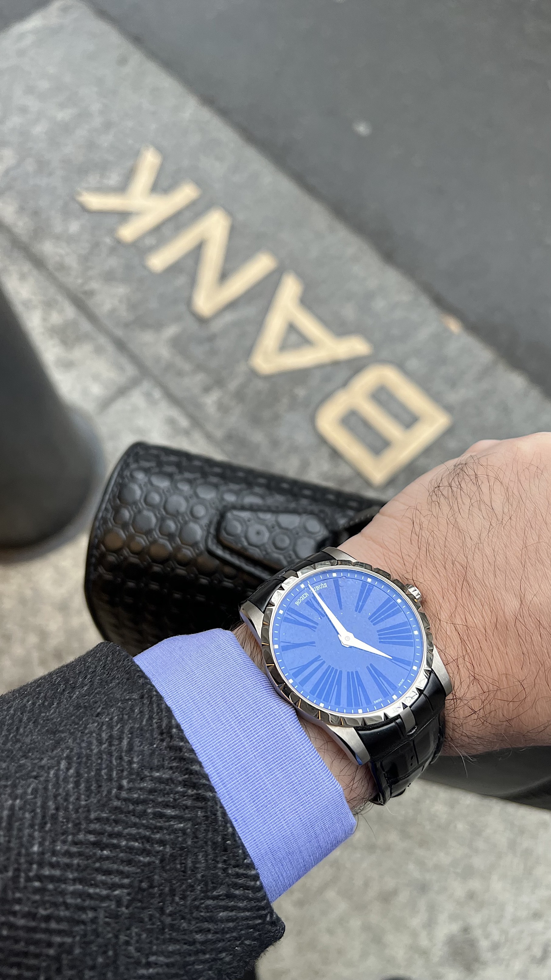 Today the motto is "no rules, our game" and is mostly specialisied in very high end watches mostly with their now typical skeletonised dials. In 2012 the lineup included some more classic design and definitely different. We review a watch launched in that year, the Roger Dubuis Excaibur 42 with Lapis lazuli dial Ref. RDDBEX0349.