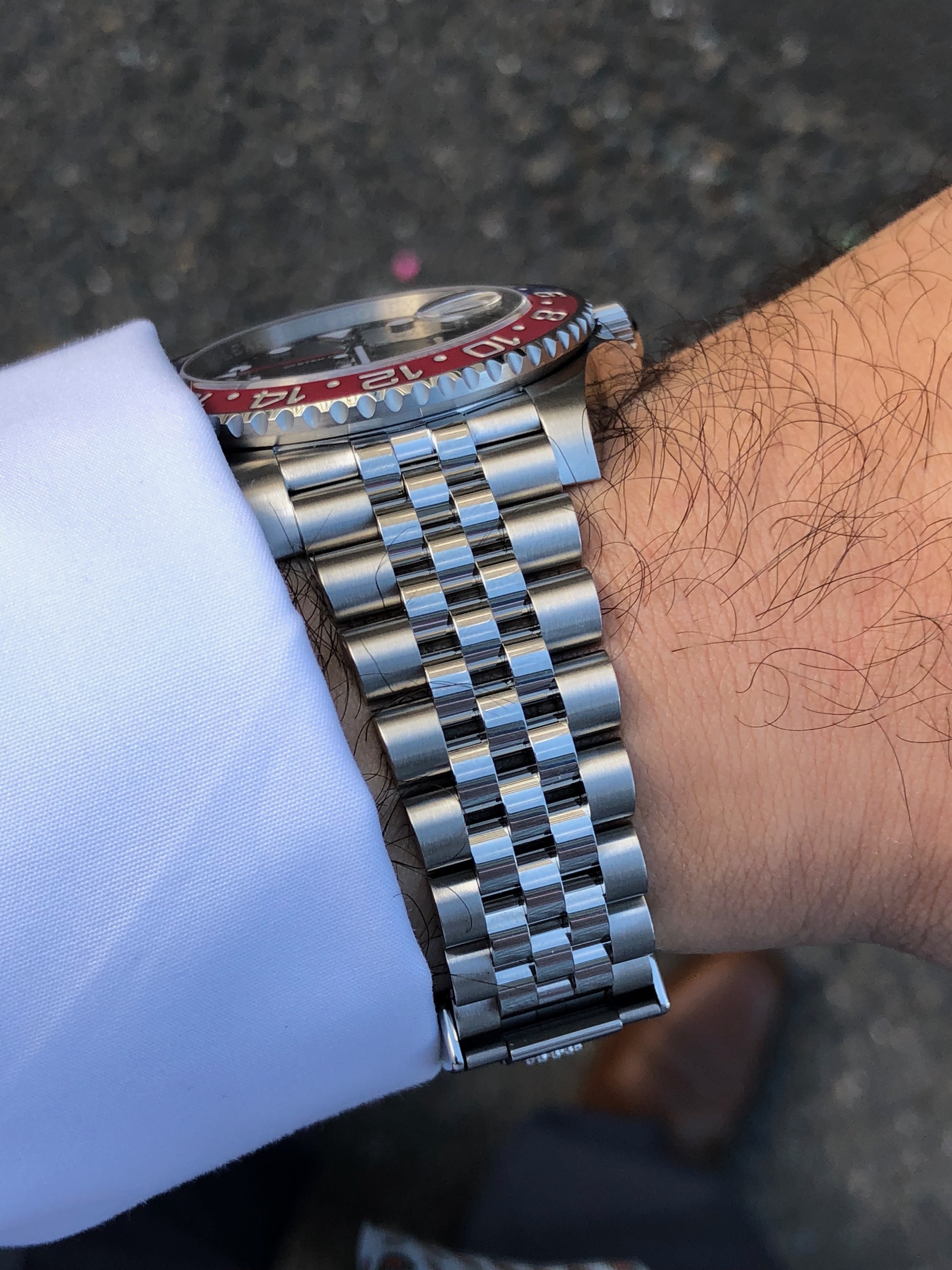 I feel that many critics or bloggers misunderstood the power of the jubilee bracelet. This is the core difference to the white gold version and the observer will know that this bracelet only existed for GMT vintage models. To me this is a great feature: I love jubilee and for everyone with another model with a oyster bracelet (e.g. Submariner, Daytona or another GMT) this is a welcome differentiation.