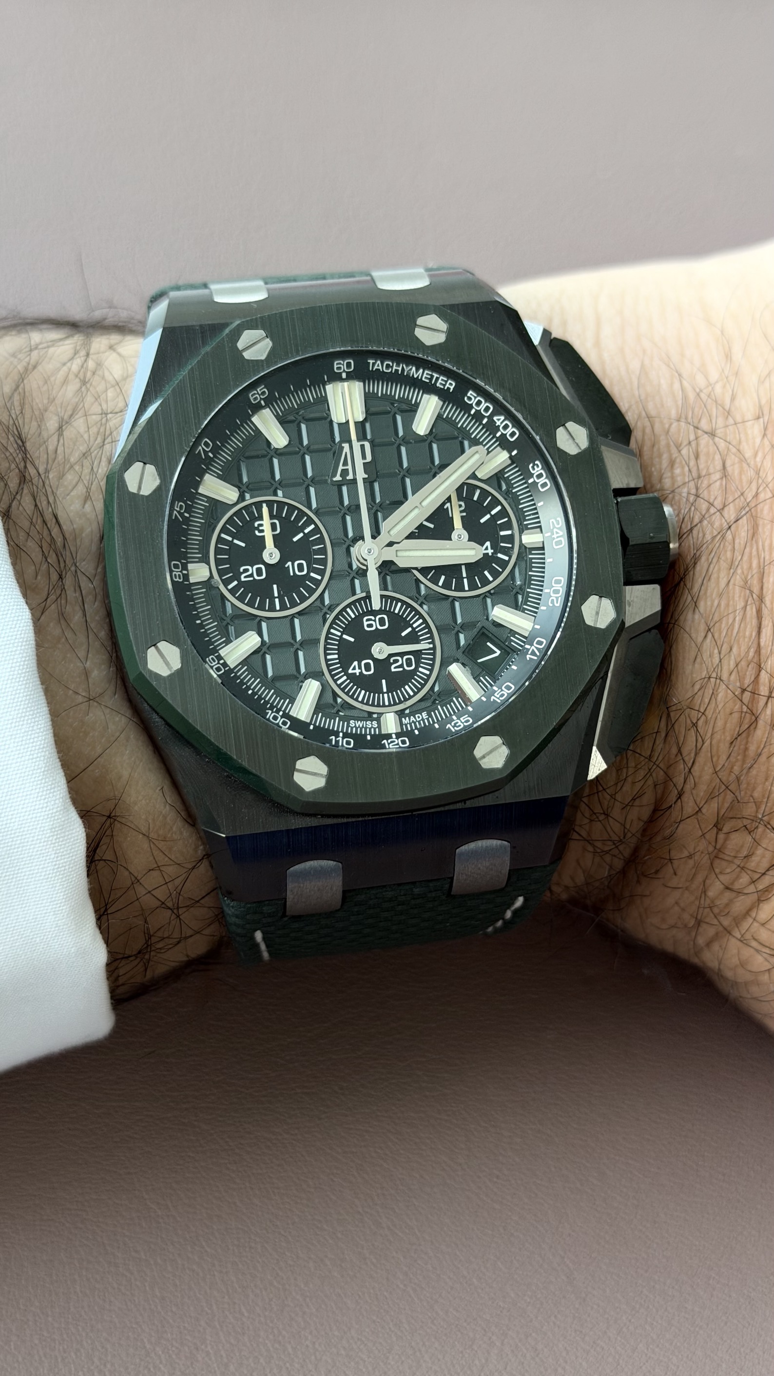 I visited the local AP house without looking for a specific watch but to check what was available a few years after the "old sold out" market hype for anything Audemars. I had the chance to try a few Code 11.59 watches—which could be seen as charming in their own right—but also a few Royal Oak Offshores that were available for purchase. The Audemars Piguet Royal Oak Offshore Ref. 26420CE.OO.A063VE.01 caught my eye immediately as the black ceramic case combined with the forest dark green makes the watch appear more understated and somehow smaller. I loved the look and, comparing it with the 42mm, it appears more comfortable thanks to the new case construction that is slightly curved and fits better on the wrist. The all-ceramic chronograph pushers remind me of the construction of the AP concept watches—so much more futuristic than the historic 42mm.