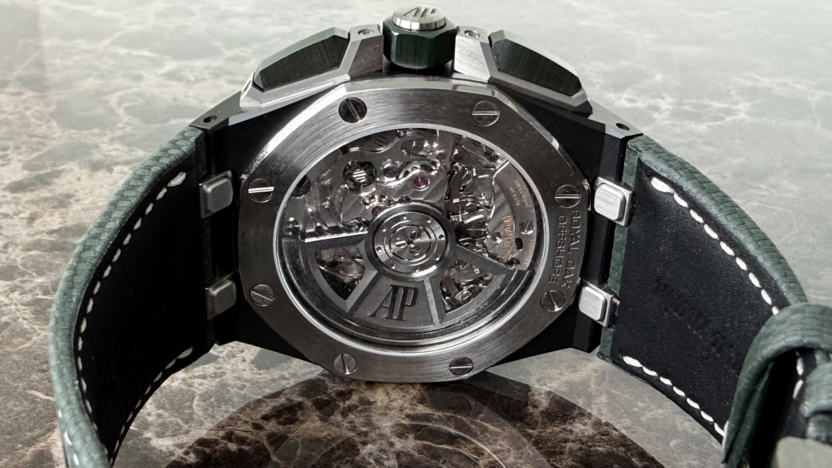 The Audemars Piguet Royal Oak Offshore Ref. 26420CE.OO.A063VE.01 in dark green and black ceramic is the latest 2025 release with a fully ceramic case that makes it much lighter. The bezel and back of the case are in titanium, keeping the watch light and comfortable.
