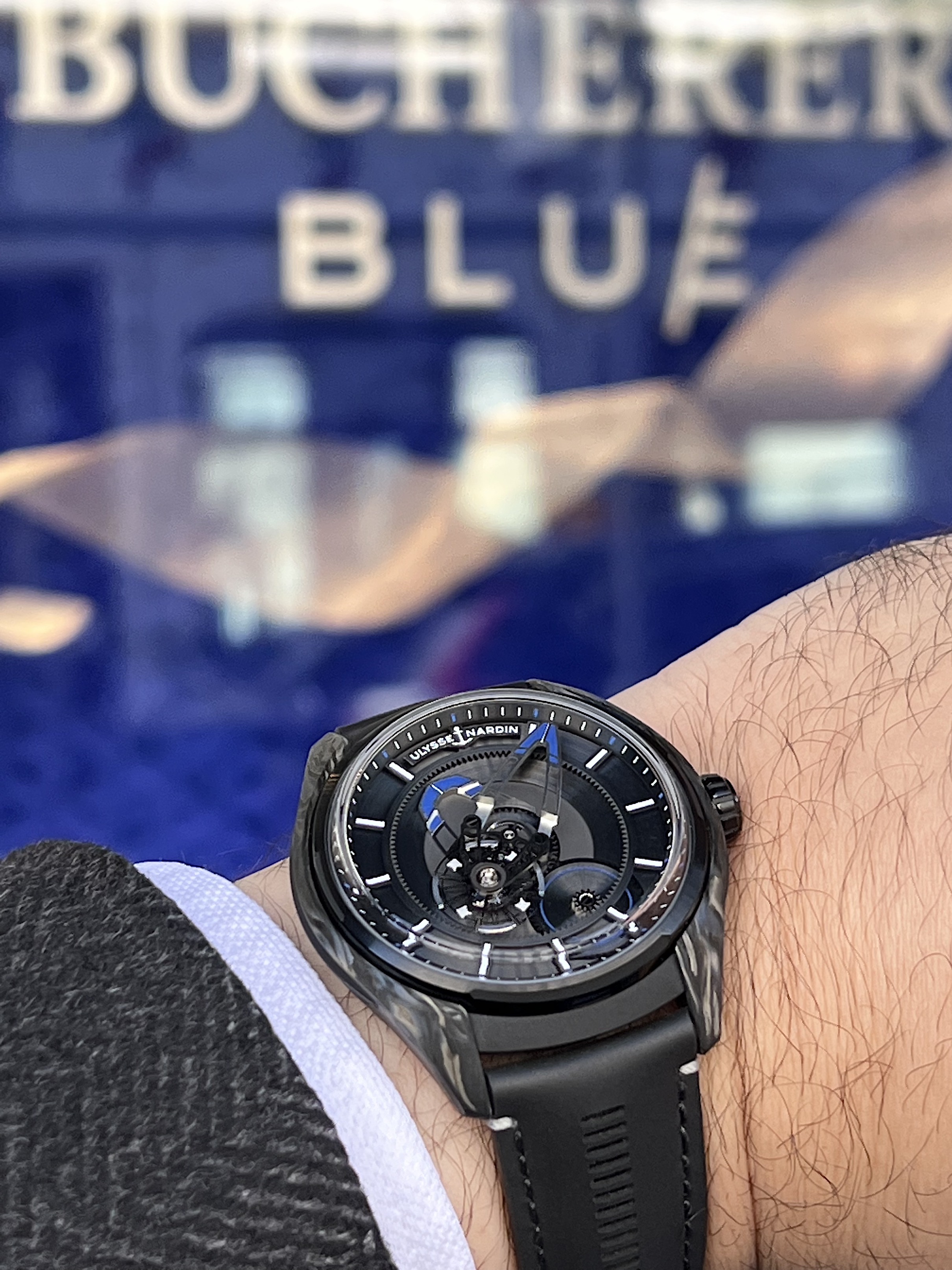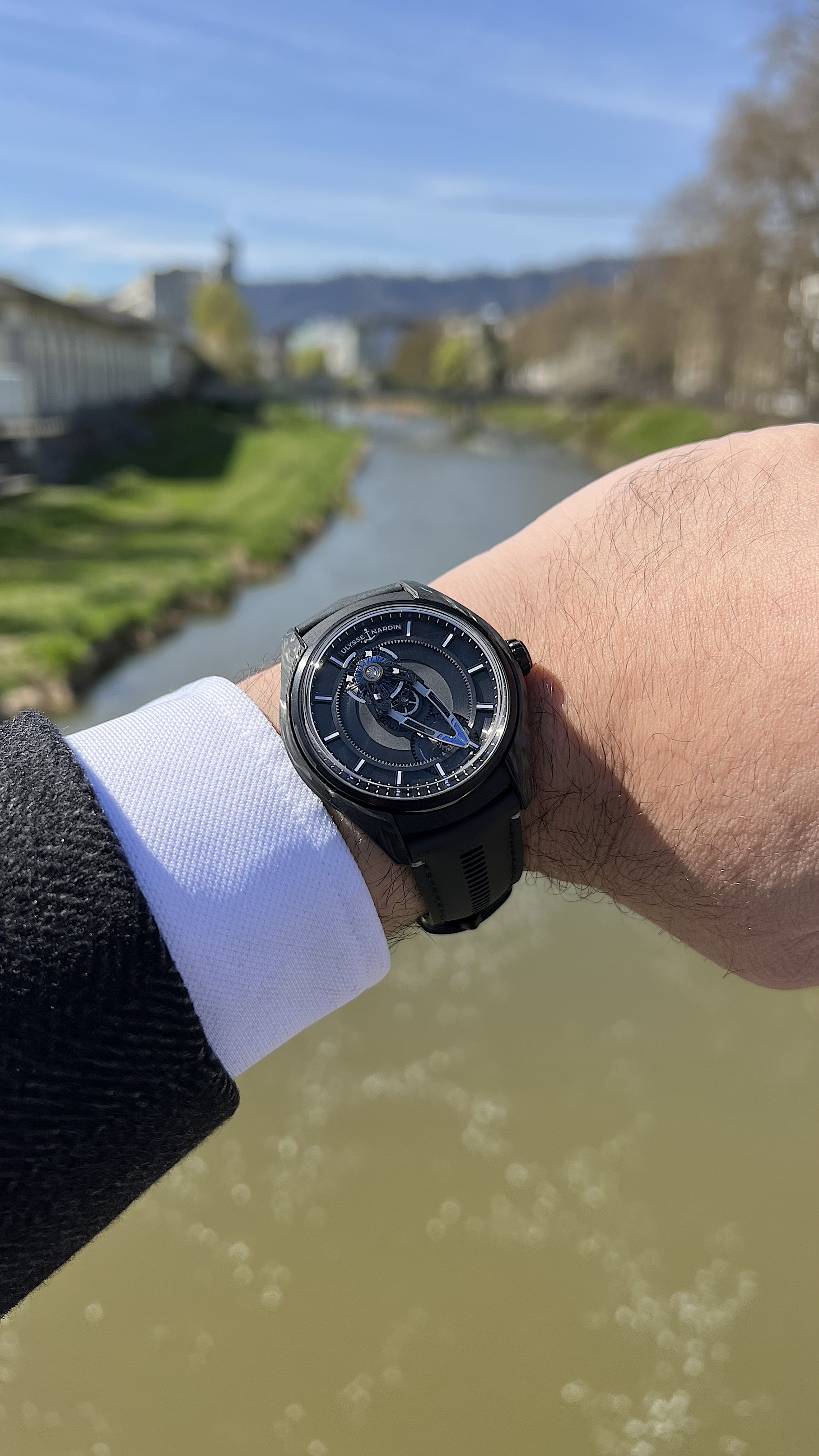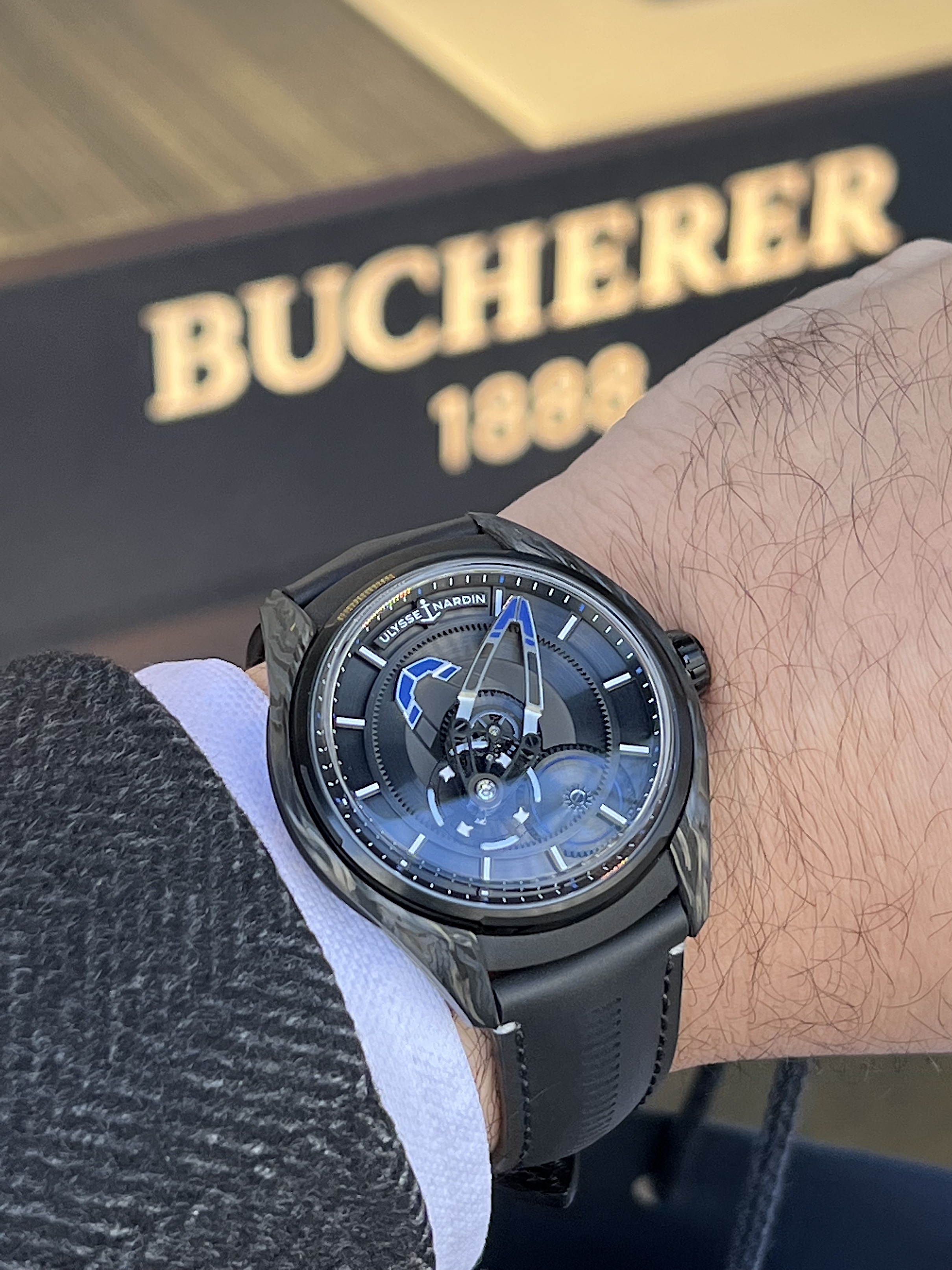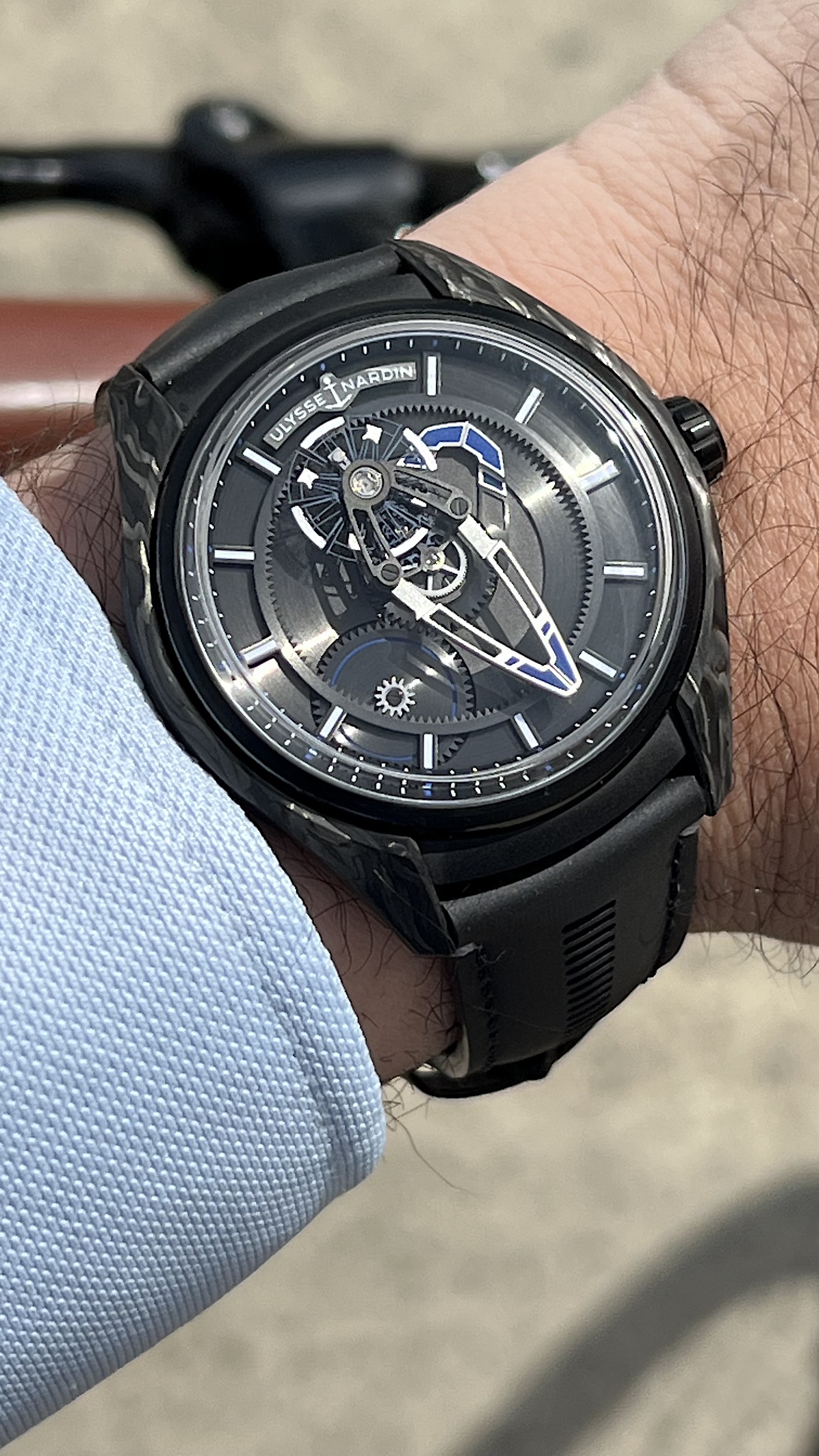 The Freak X is a slimmed down version in terms of movement but also size and price. The case is 43mm but wears very well, pretty much like a Rolex GMT. The watch is very light due to the case in Carbonium (full watch with strap is just 81 Grams).